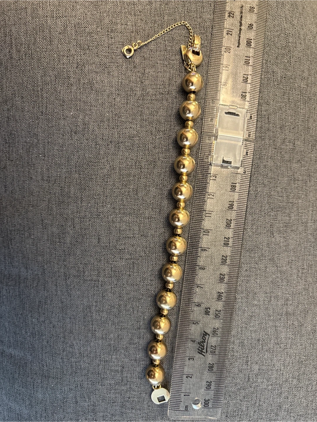 This is a classic gold tone beaded bracelet by Monet. It features large, shiny beads interspersed with smaller accent beads, and a secure clasp. The bracelet has a safety chain for added security.