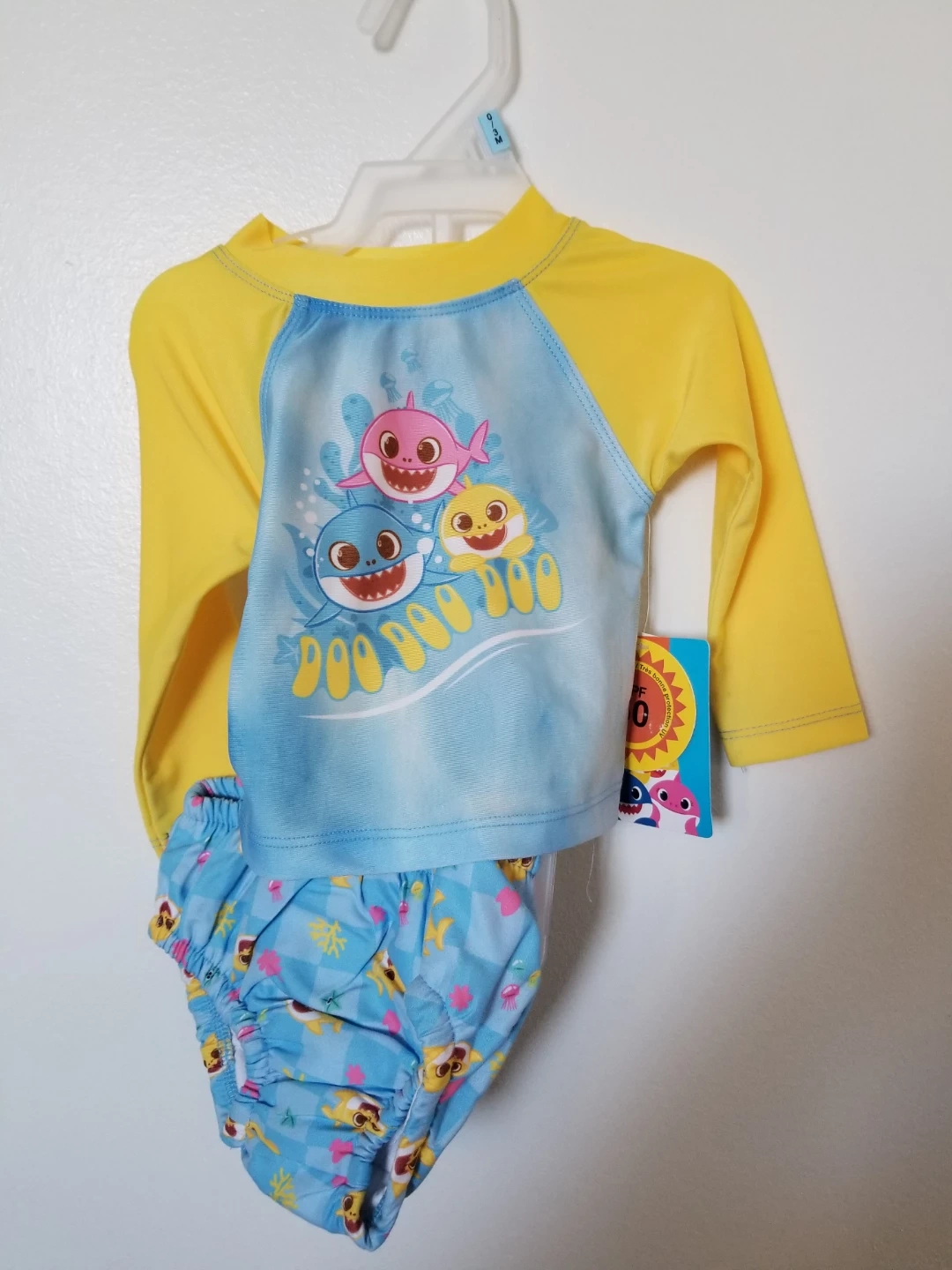 This adorable Baby Shark swim set is brand new with tags! It features a bright yellow long-sleeve rash guard with UPF 50 protection, perfect for keeping your little one safe in the sun. The set also includes cute blue swim trunks with a Baby Shark pattern. Size is 0-3 months, ready for your little swimmer!