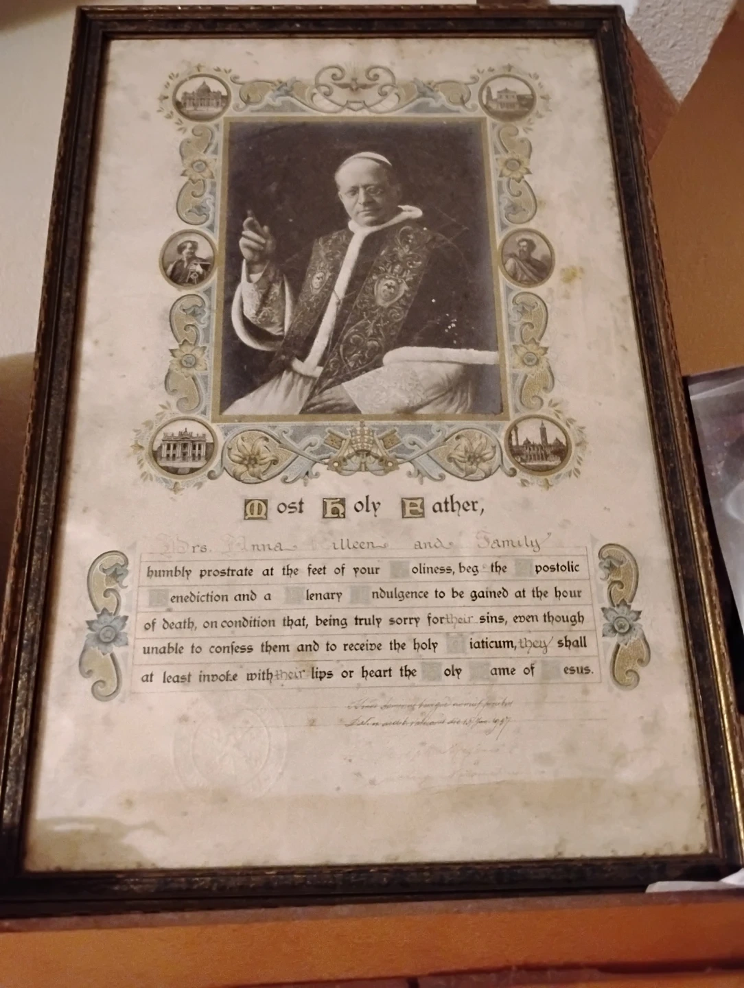 This is a framed print featuring a religious figure and ornate decorative elements. The frame is dark wood, and the print includes text and illustrations. It would make a unique addition to any home.