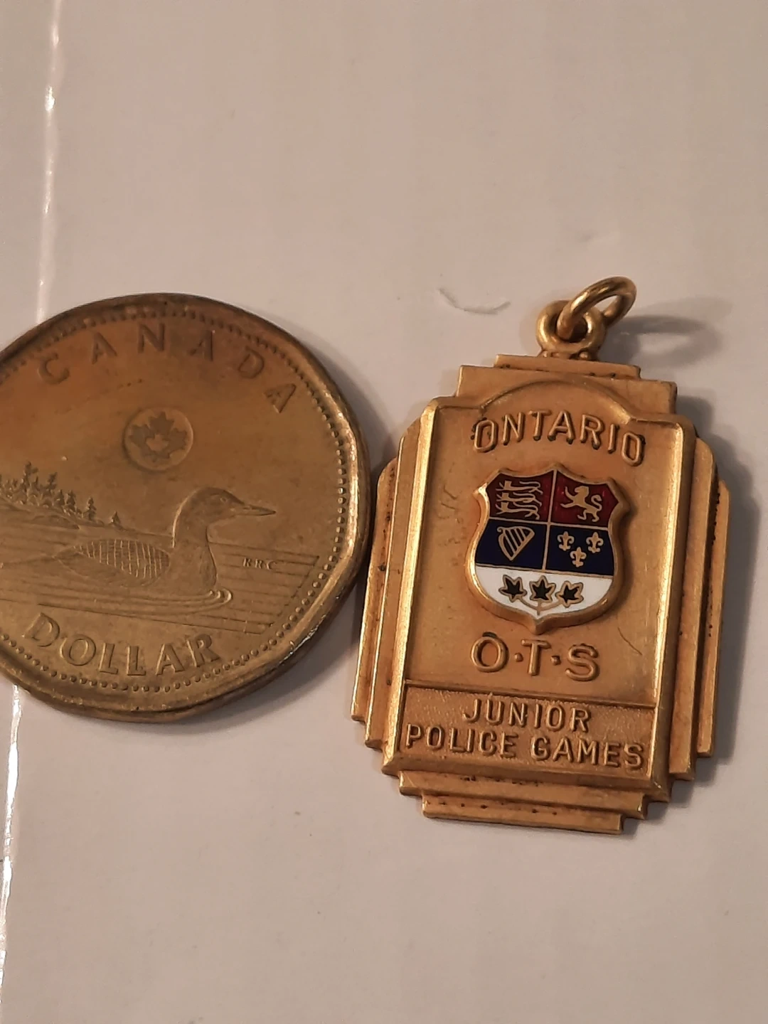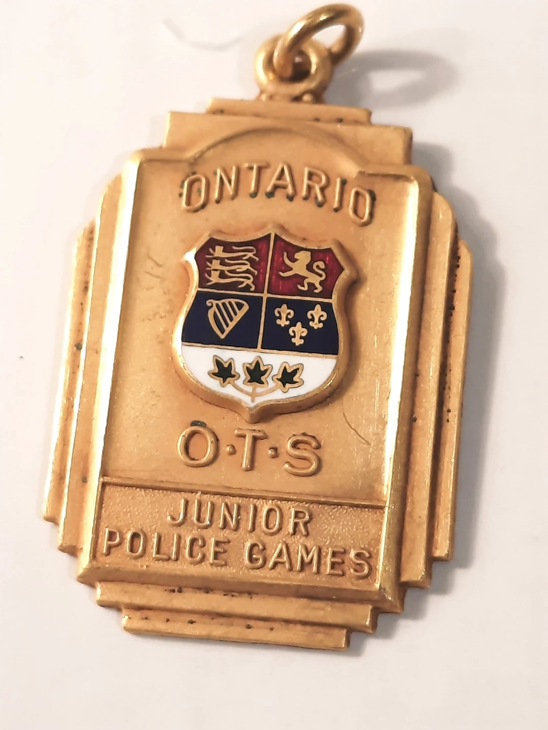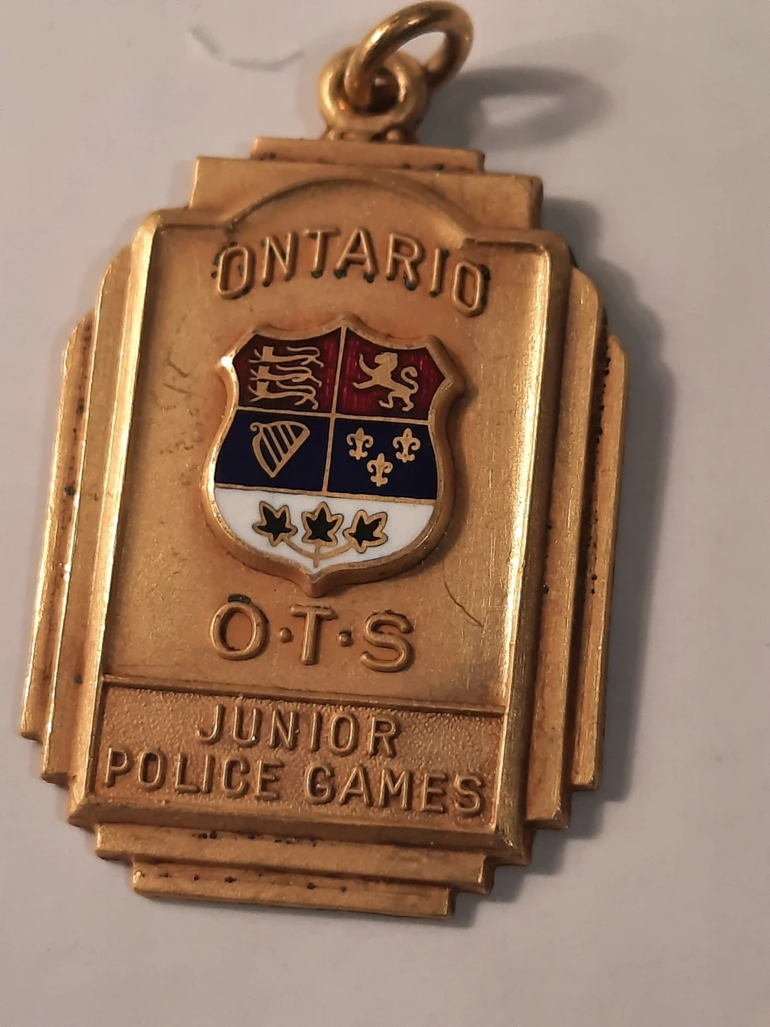 This vintage medal is for the Ontario OTS Junior Police Games. It's made of metal and features the Ontario crest and 'OTS' insignia. Engraved on the back are 'EDWARDS G&F'.gold filled.gold tone