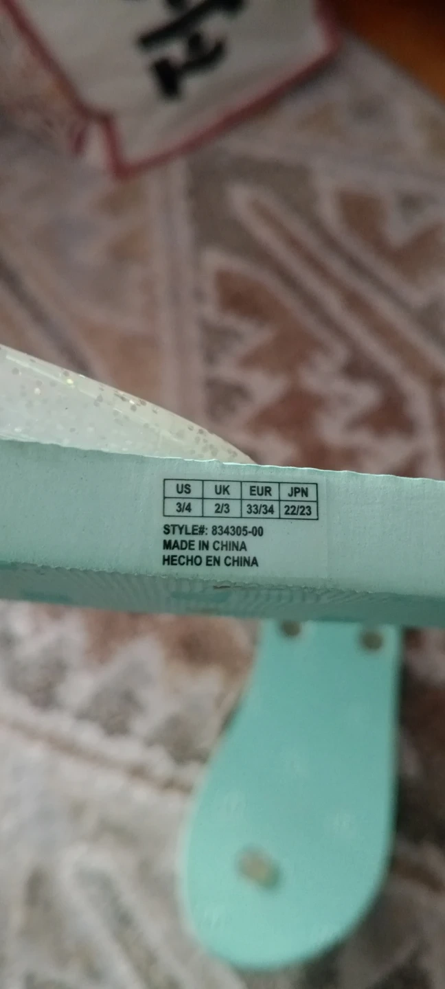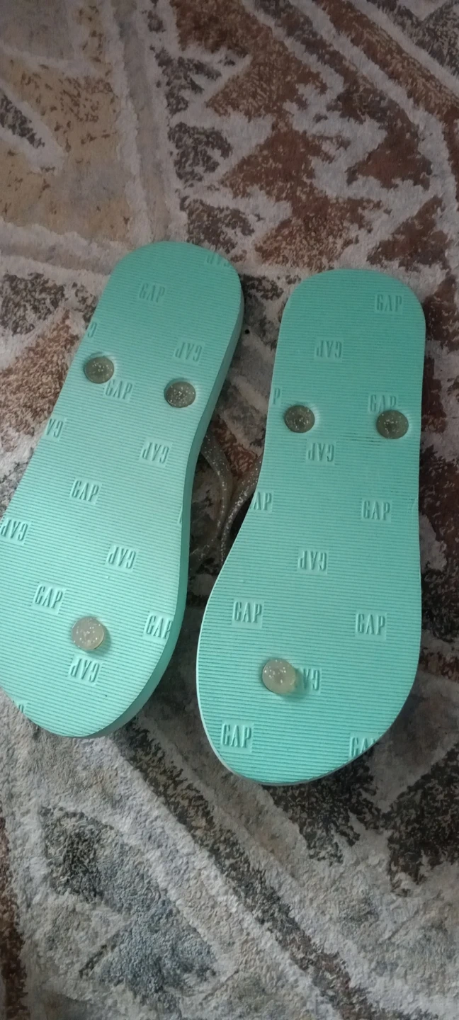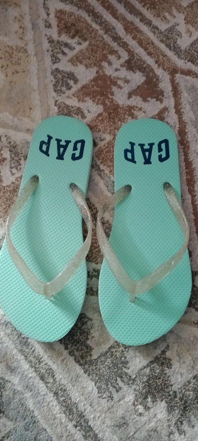 These mint green flip flops are from GAP and feature a glittery strap. They're made in China with a US size 3/4. Perfect for summer days!