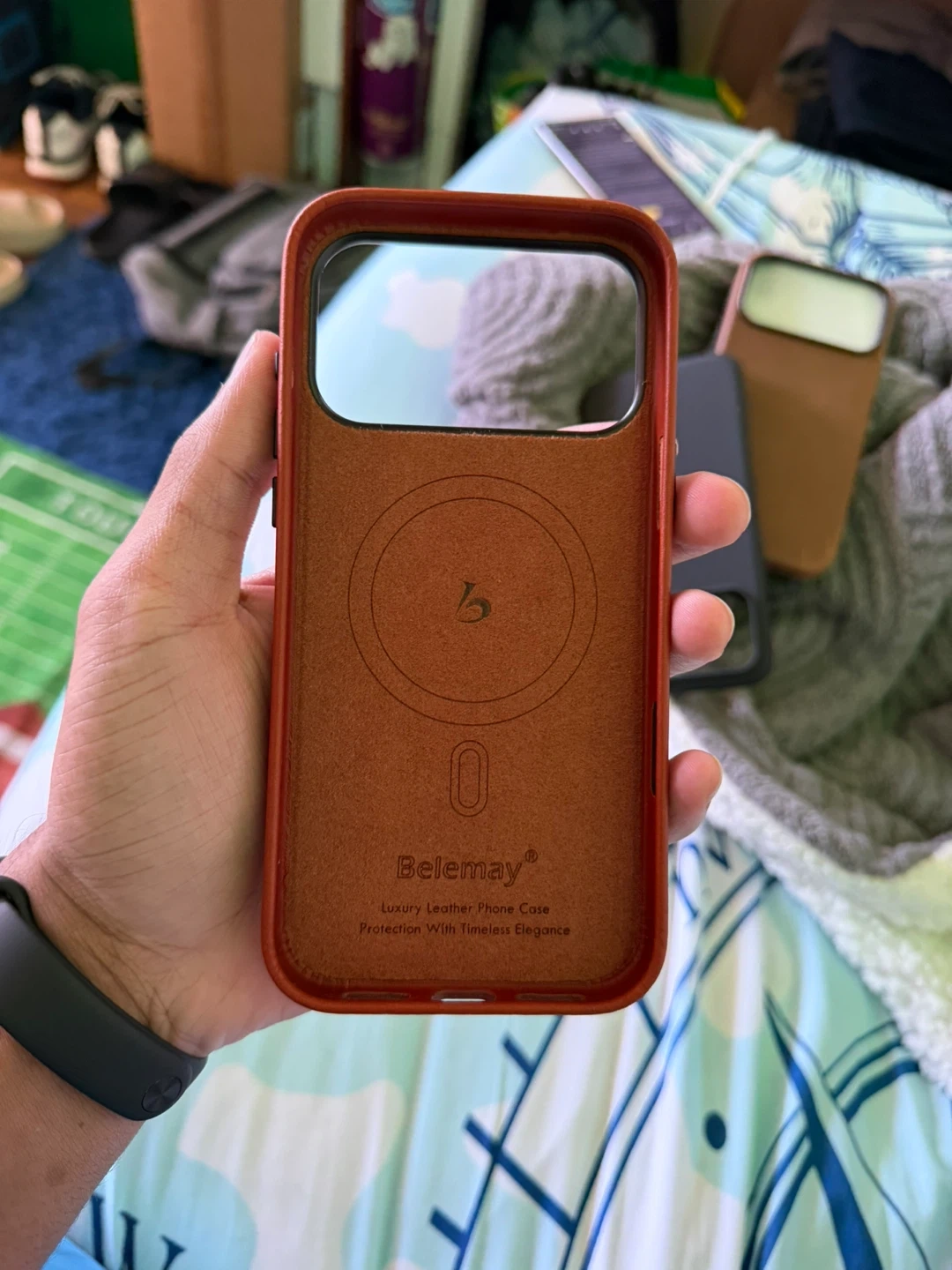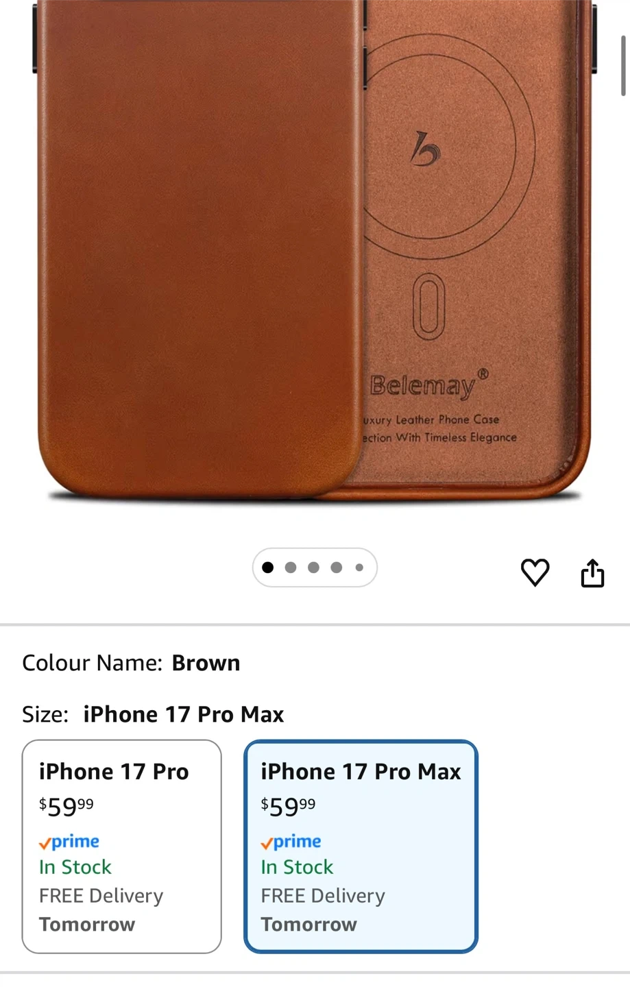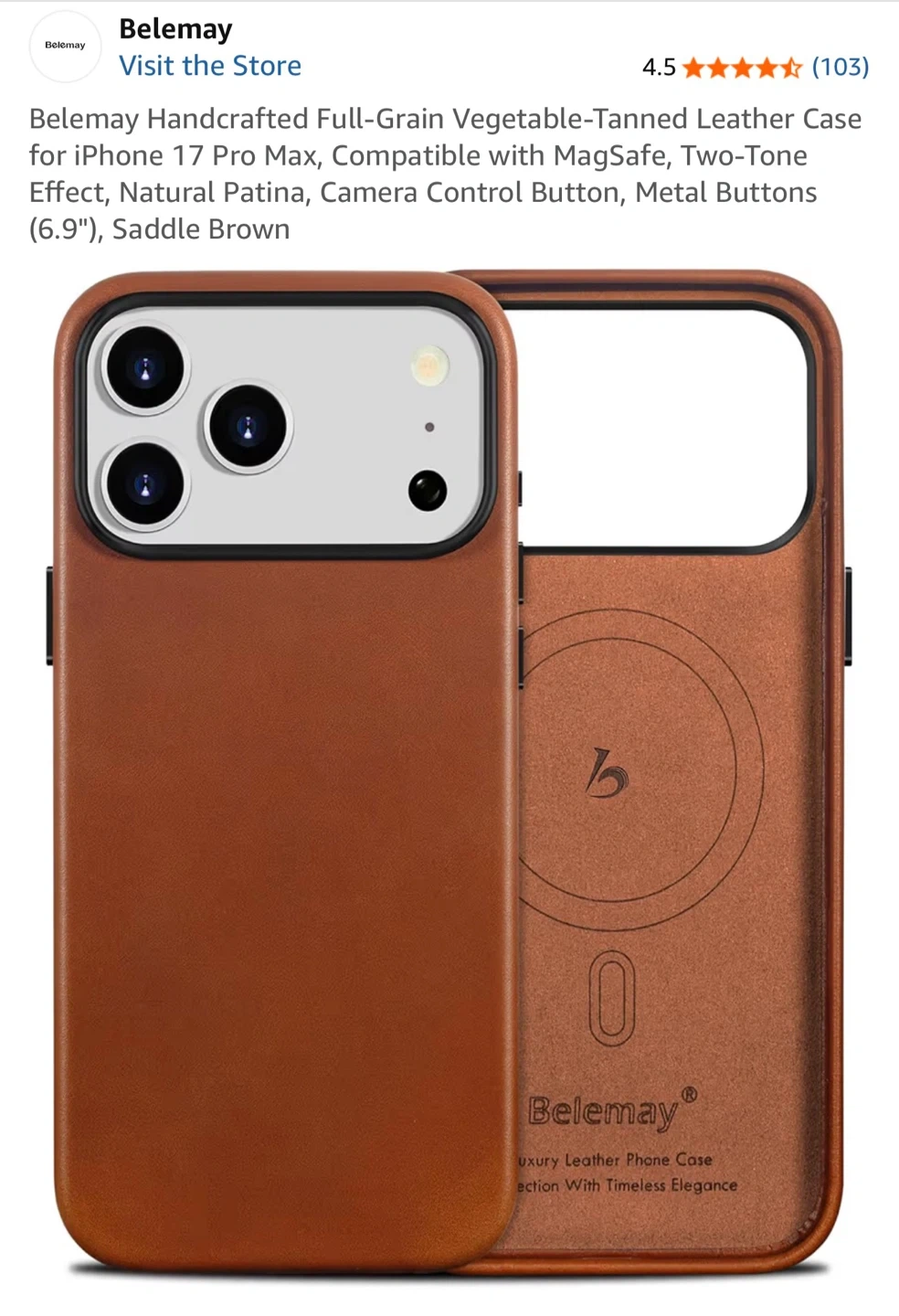 This is a Belemay handcrafted full-grain vegetable-tanned leather case. It's designed for the iPhone 17 Pro Max and is compatible with MagSafe. It has metal buttons and a two-tone effect.