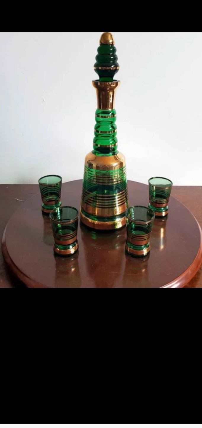 Vintage Green and Gold Decanter Set with 4 Glasses