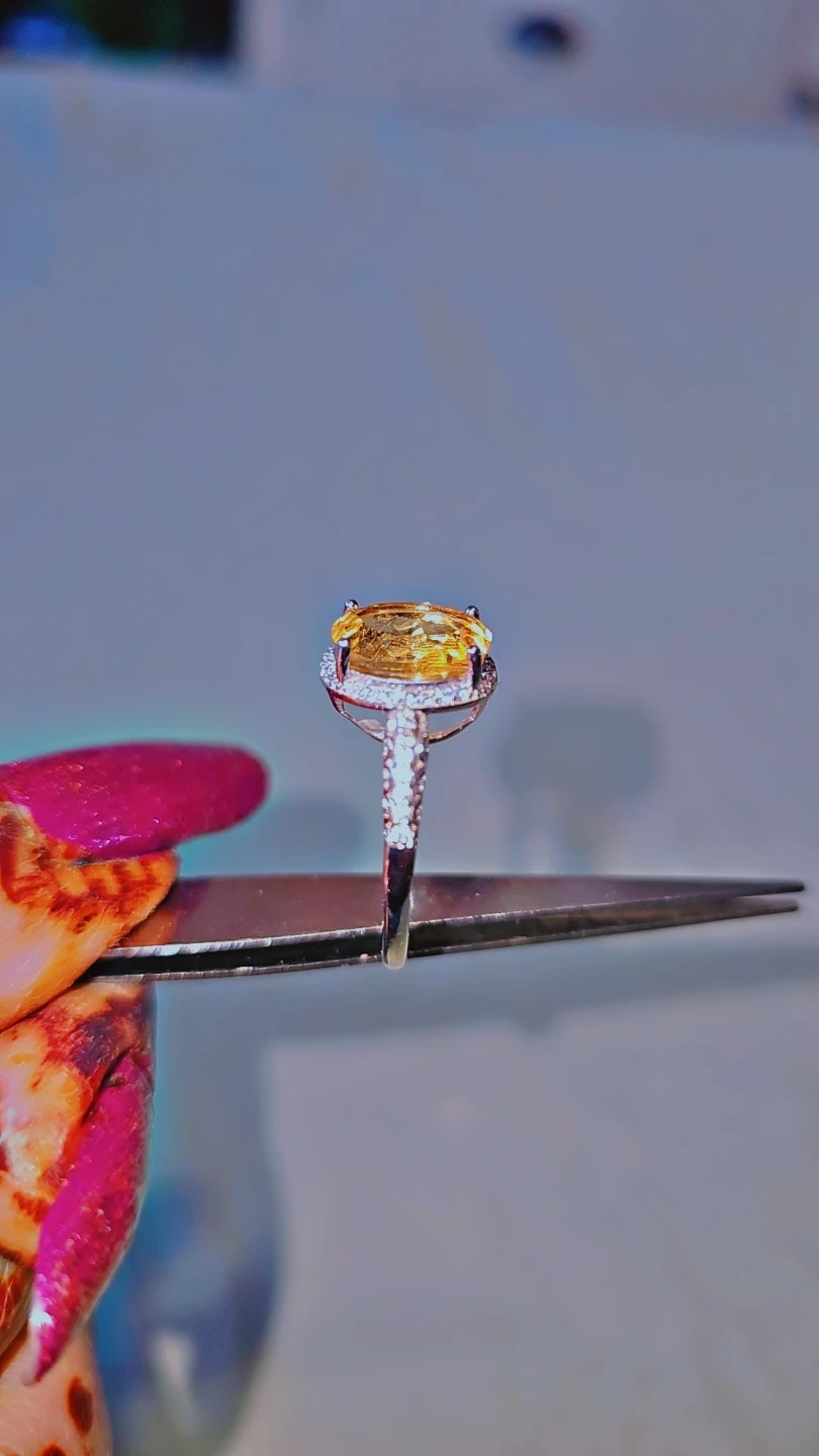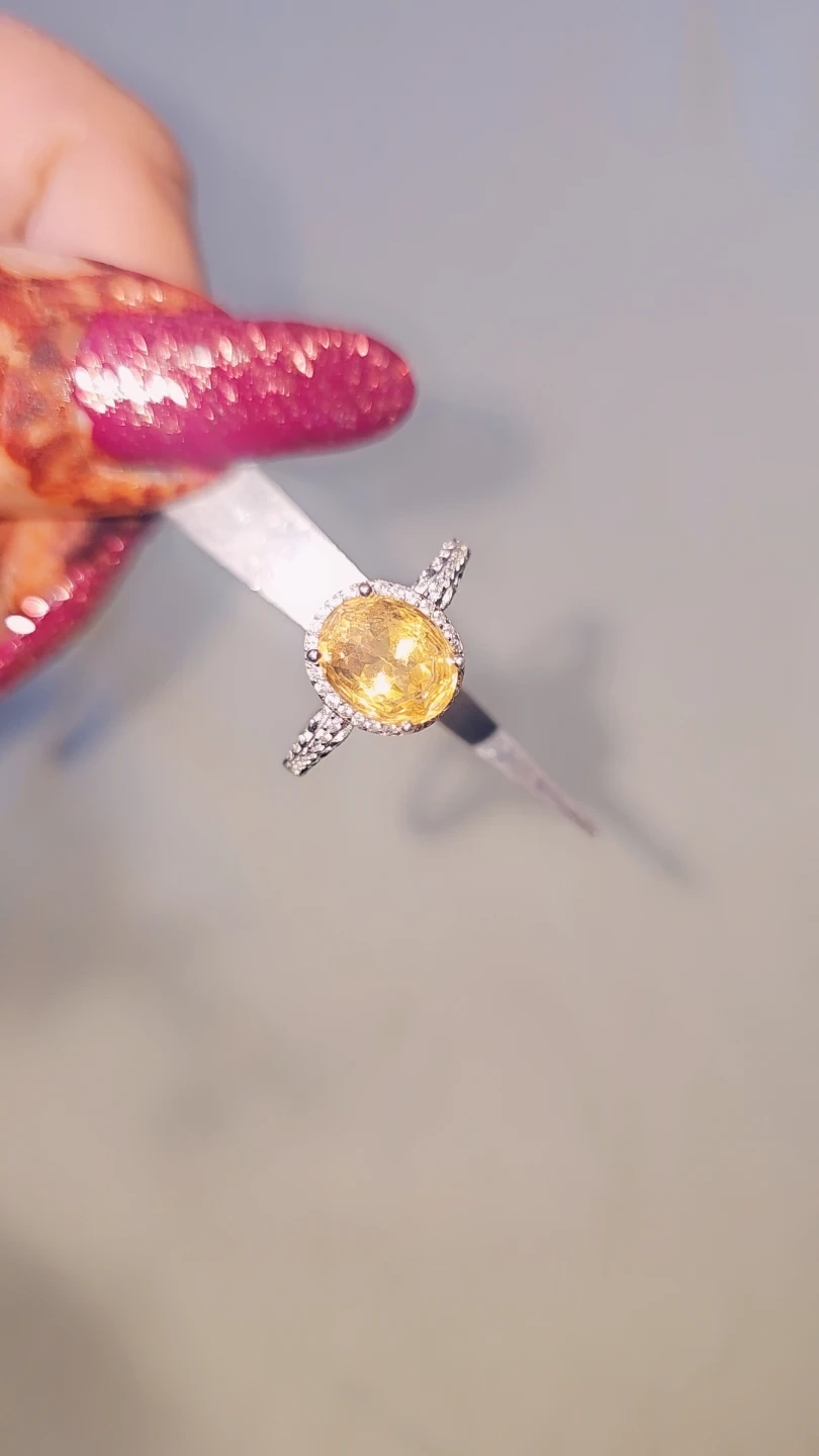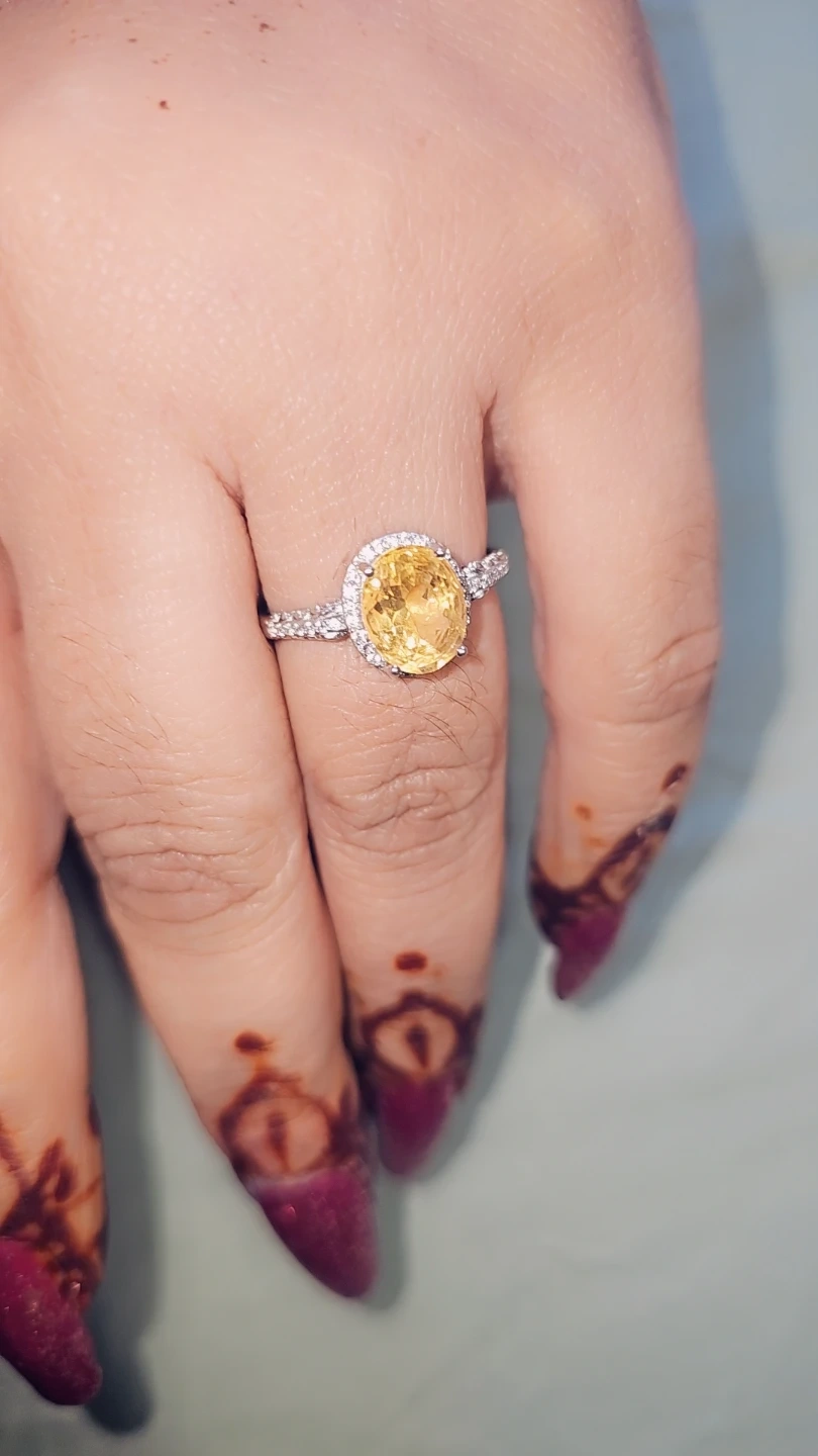 This beautiful ring features a striking oval-cut Citrine gemstone, surrounded by a halo of small, sparkling diamonds acents .The band is also adorned with diamond accents, adding extra shimmer. It's crafted in a silver S925 giving it a sophisticated look. This ring is perfect for adding a pop of colour and elegance to any outfit, or as a special gift! "