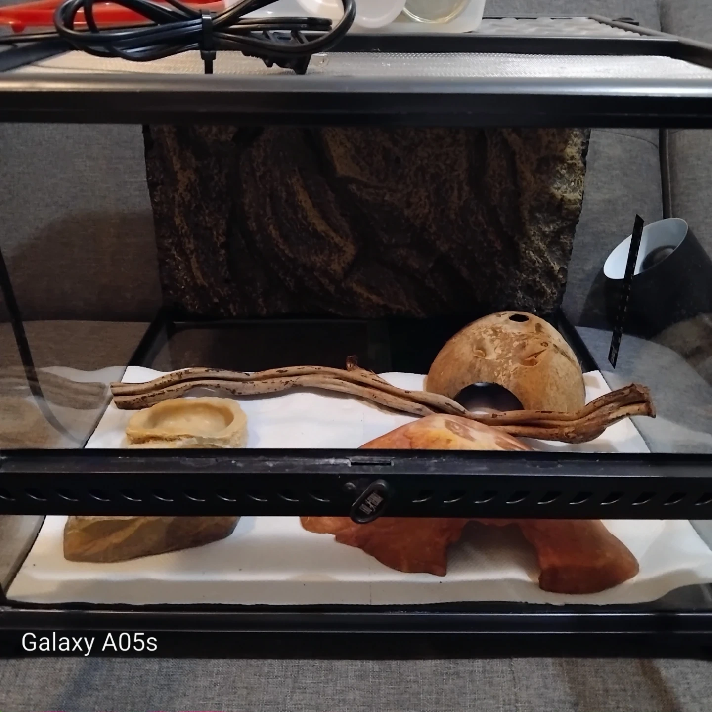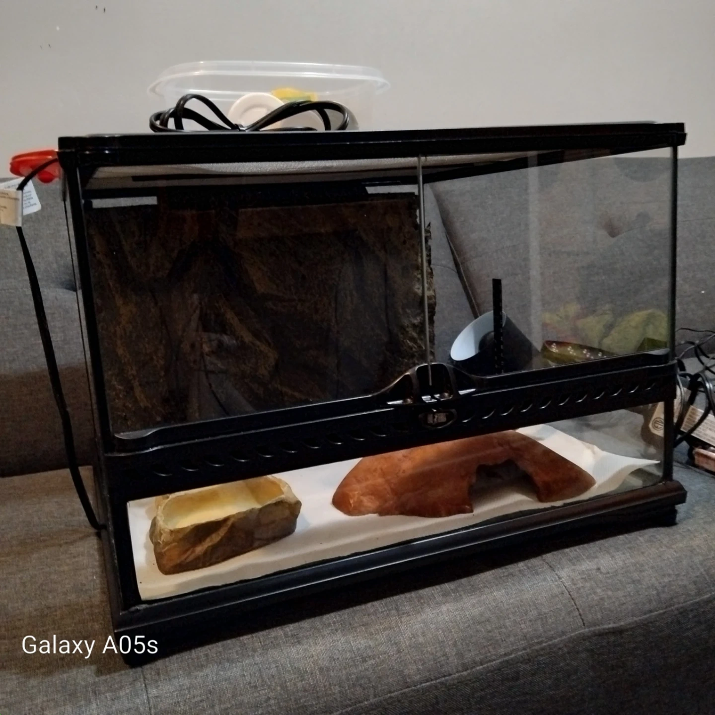 Glass terrarium suitable for reptiles or other small pets. Includes a heat lamp, food dishes, and supplements like Fluker's Repta Calcium and Zoo Med's ReptiVite. Also comes with a container for food storage.