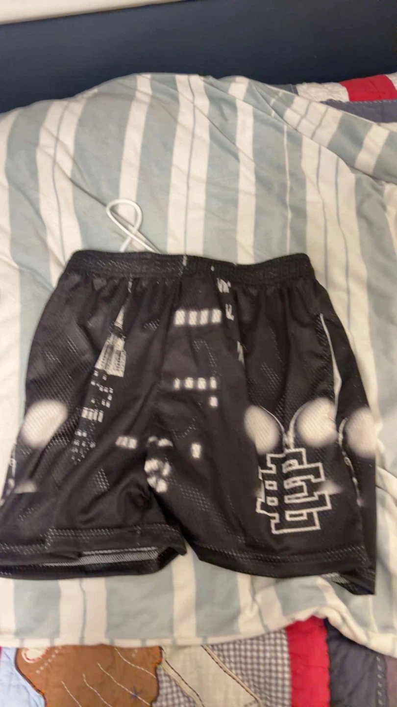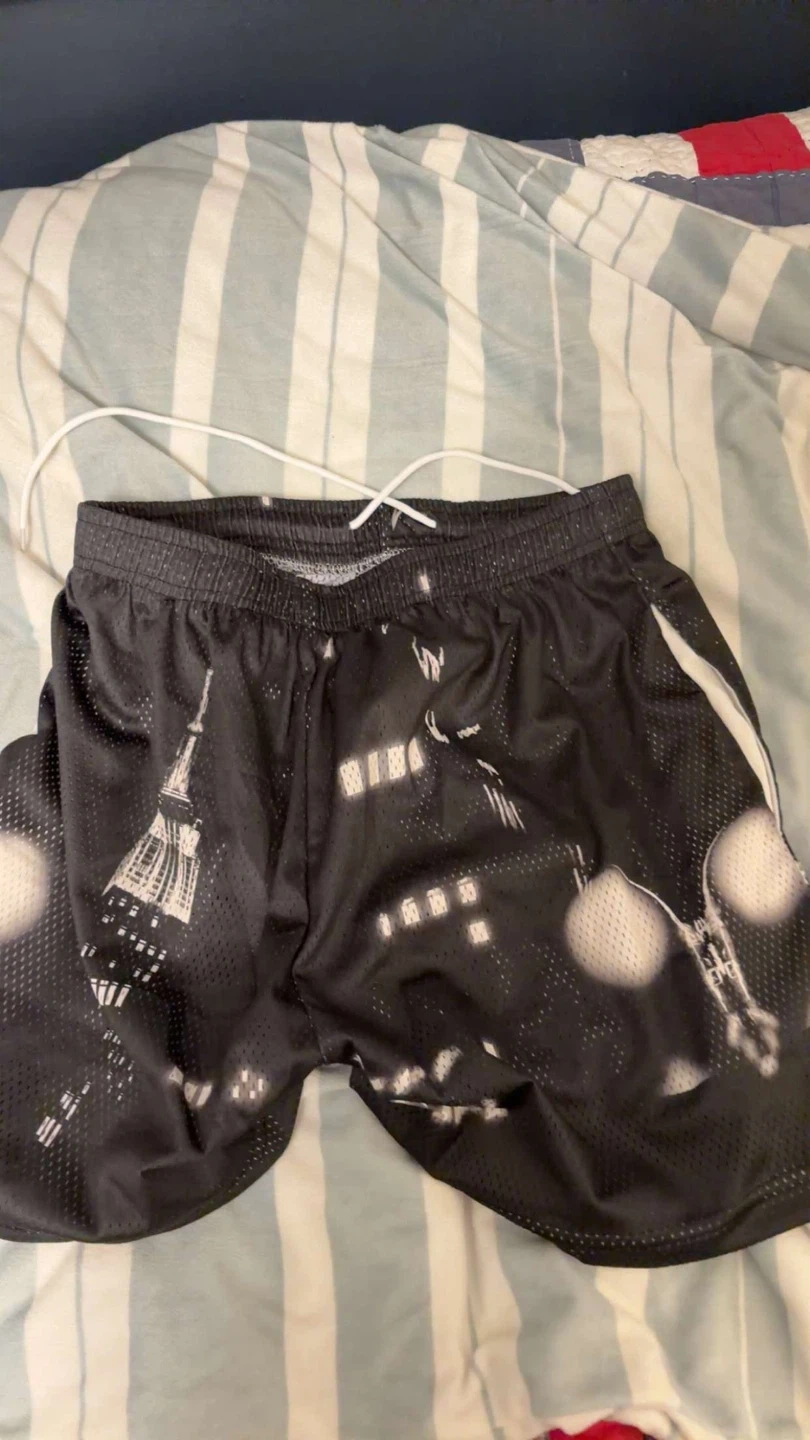 Mesh shorts with a black and white cityscape design. These shorts feature a drawstring waist for a comfortable fit. Great for casual wear or athletic activities!