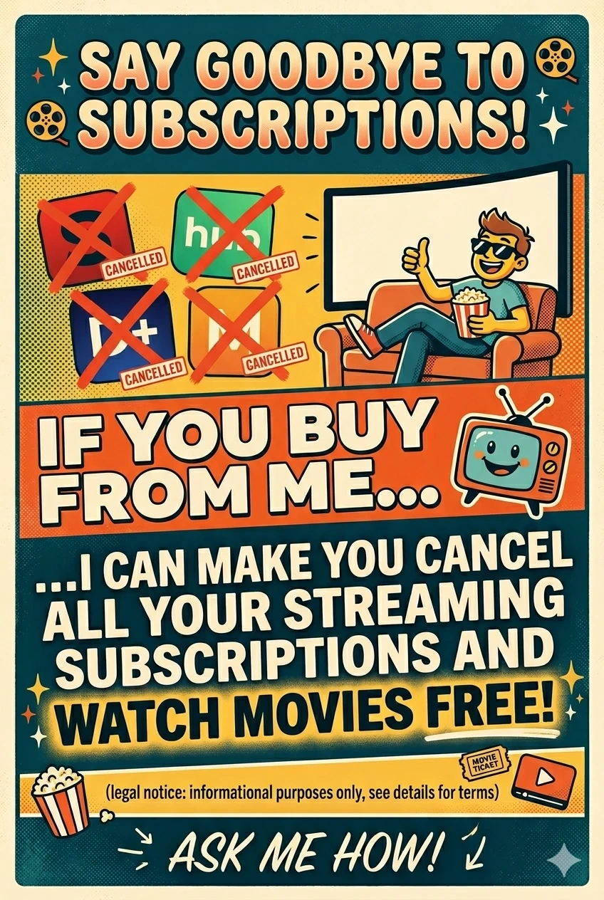 Tired of endless streaming service fees? Buy from me and I can help you cancel all your subscriptions. Watch movies for free!