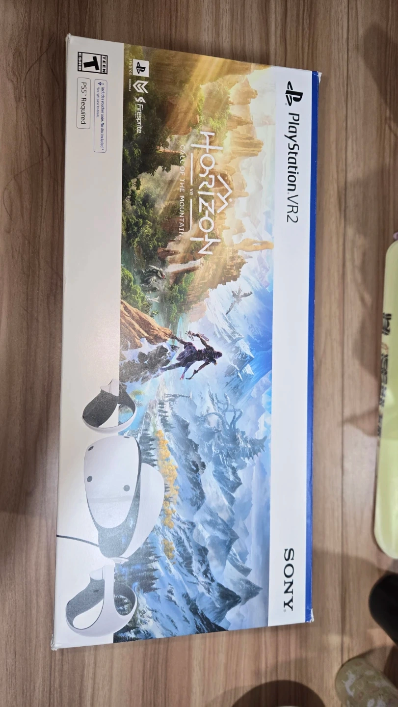 This is the Sony PlayStation VR2 headset and controllers for the Horizon Call of the Mountain bundle. It includes the headset, two Sense controllers, and necessary cables. The original packaging is present.