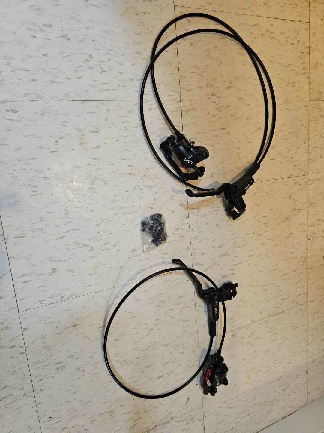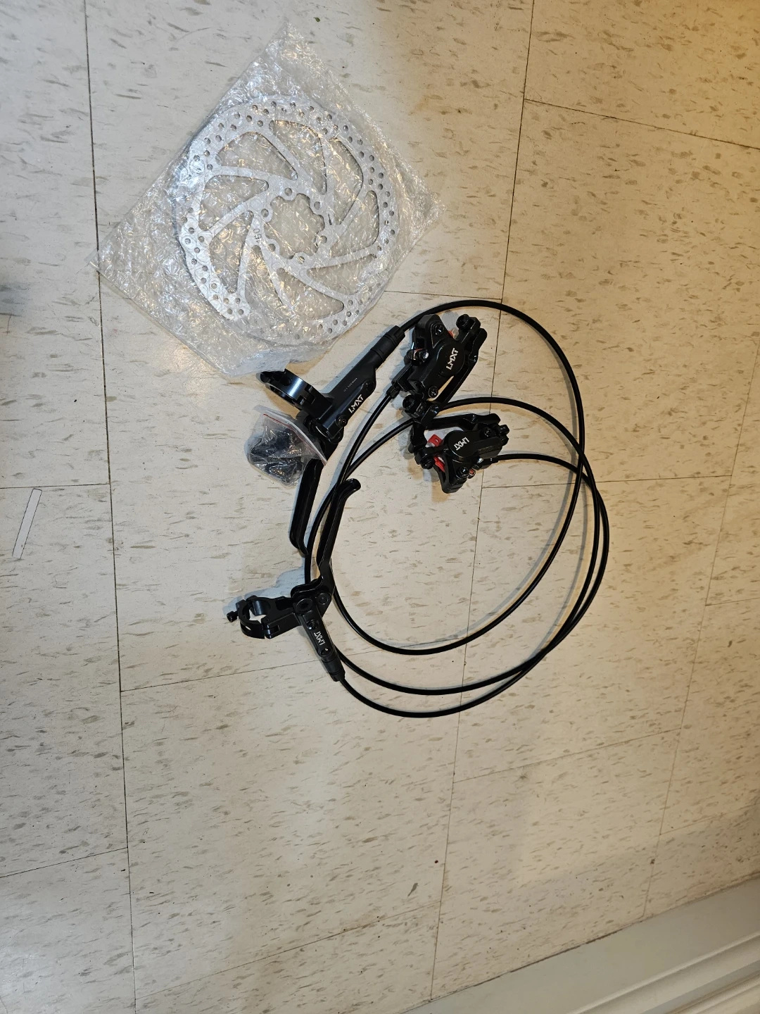This is a set of LIXMNT hydraulic disc brakes for a bicycle. It includes two brake calipers, two brake levers, hydraulic lines, and two metal rotors. All mounting hardware is also included in a separate bag.