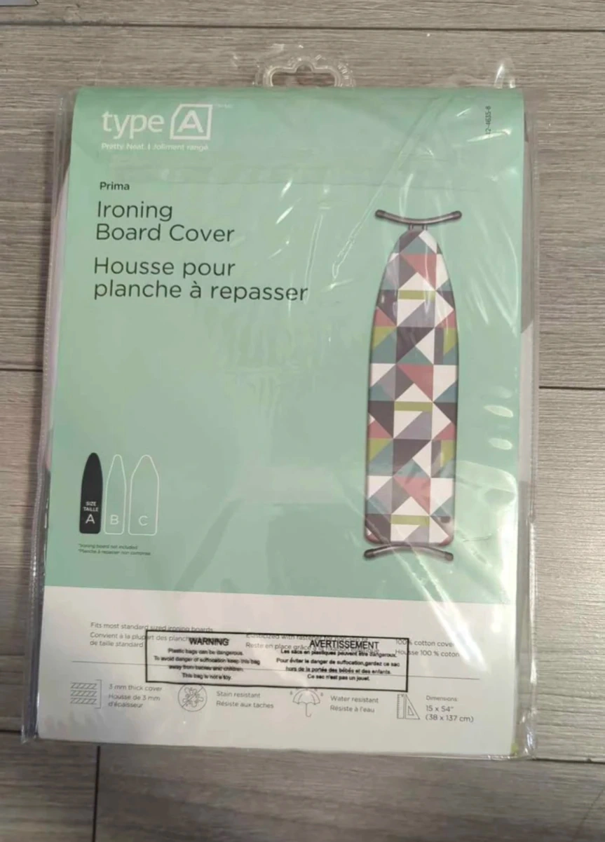 Selling a brand new ironing board cover! It fits most standard sized ironing boards and is stain and water resistant. The cover is 3 mm thick and made of 100% cotton. Dimensions are 15 x 54 inches (38 x 137 cm).