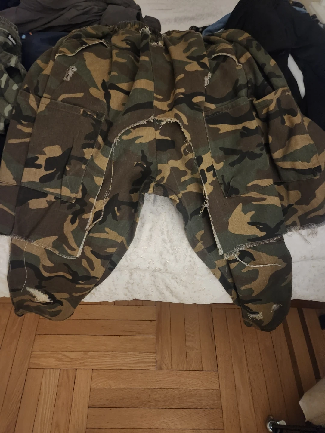 These camouflage cargo pants feature a relaxed fit and multiple pockets. The distressed detailing and raw edges give them a unique, edgy look. They're made from a durable cotton blend.
