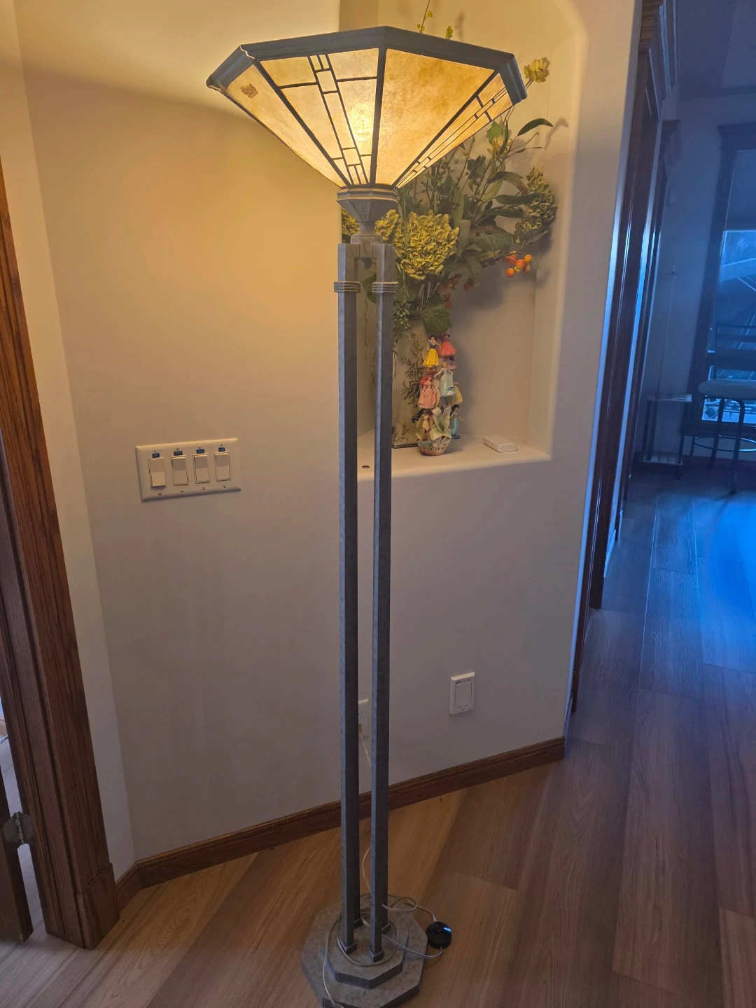 This is a Tiffany-style floor lamp with a geometric shade. It features a metal stand and a decorative base. Provides warm ambient lighting.