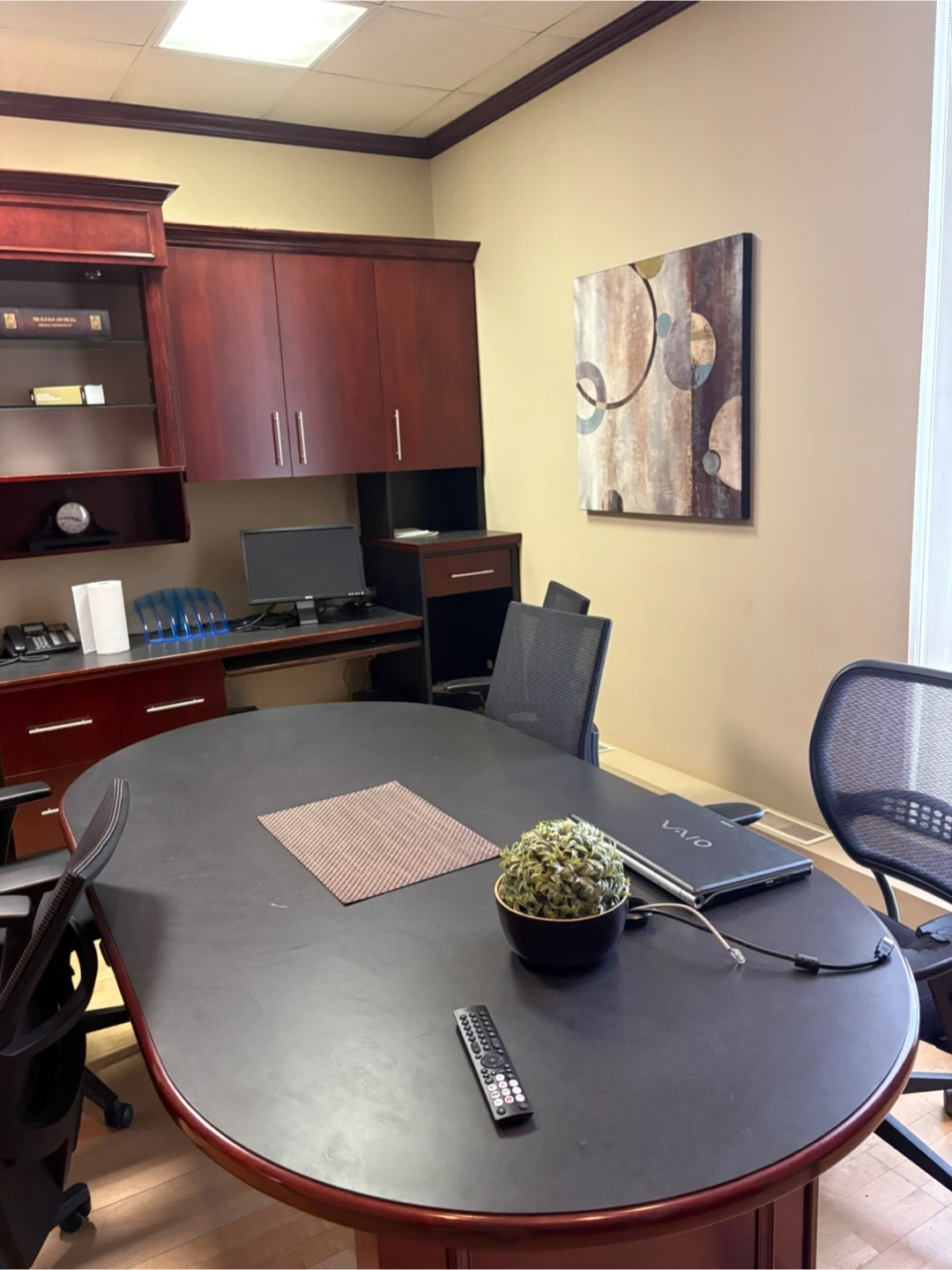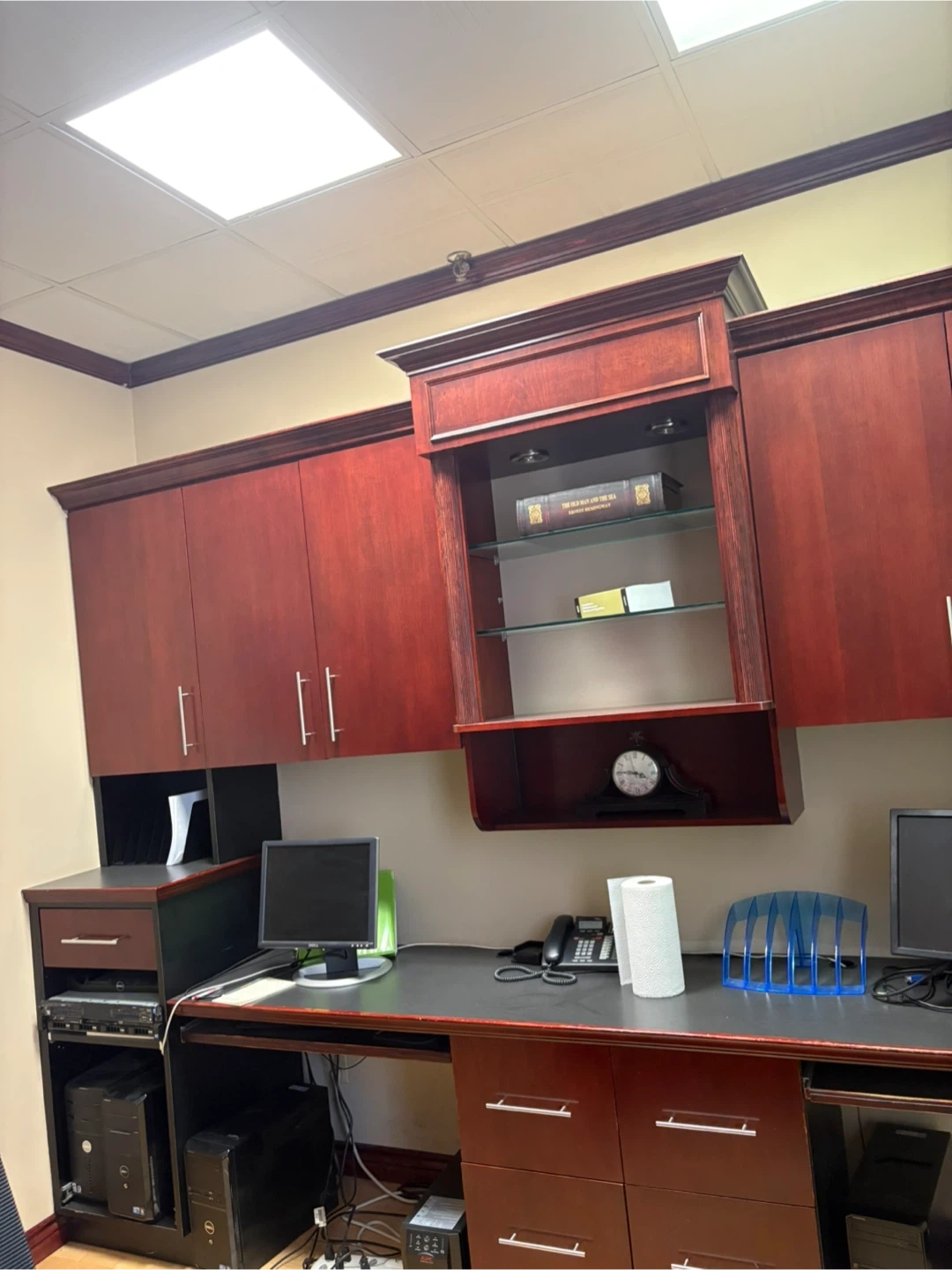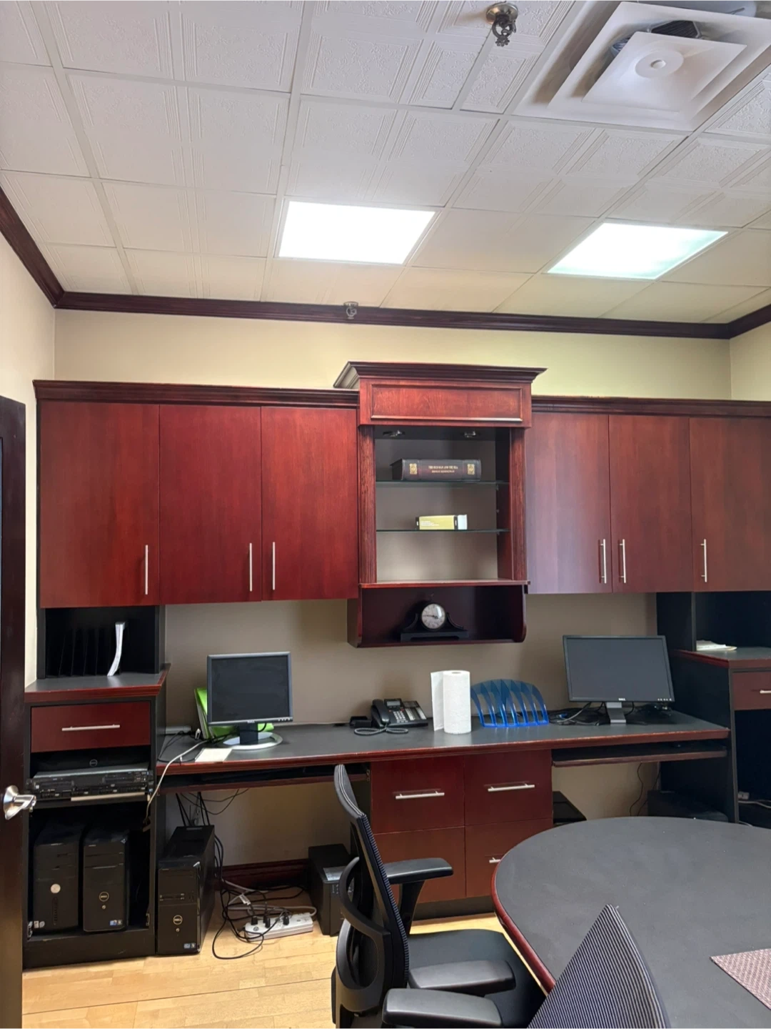 Large office desk with built-in cabinets and hutch
