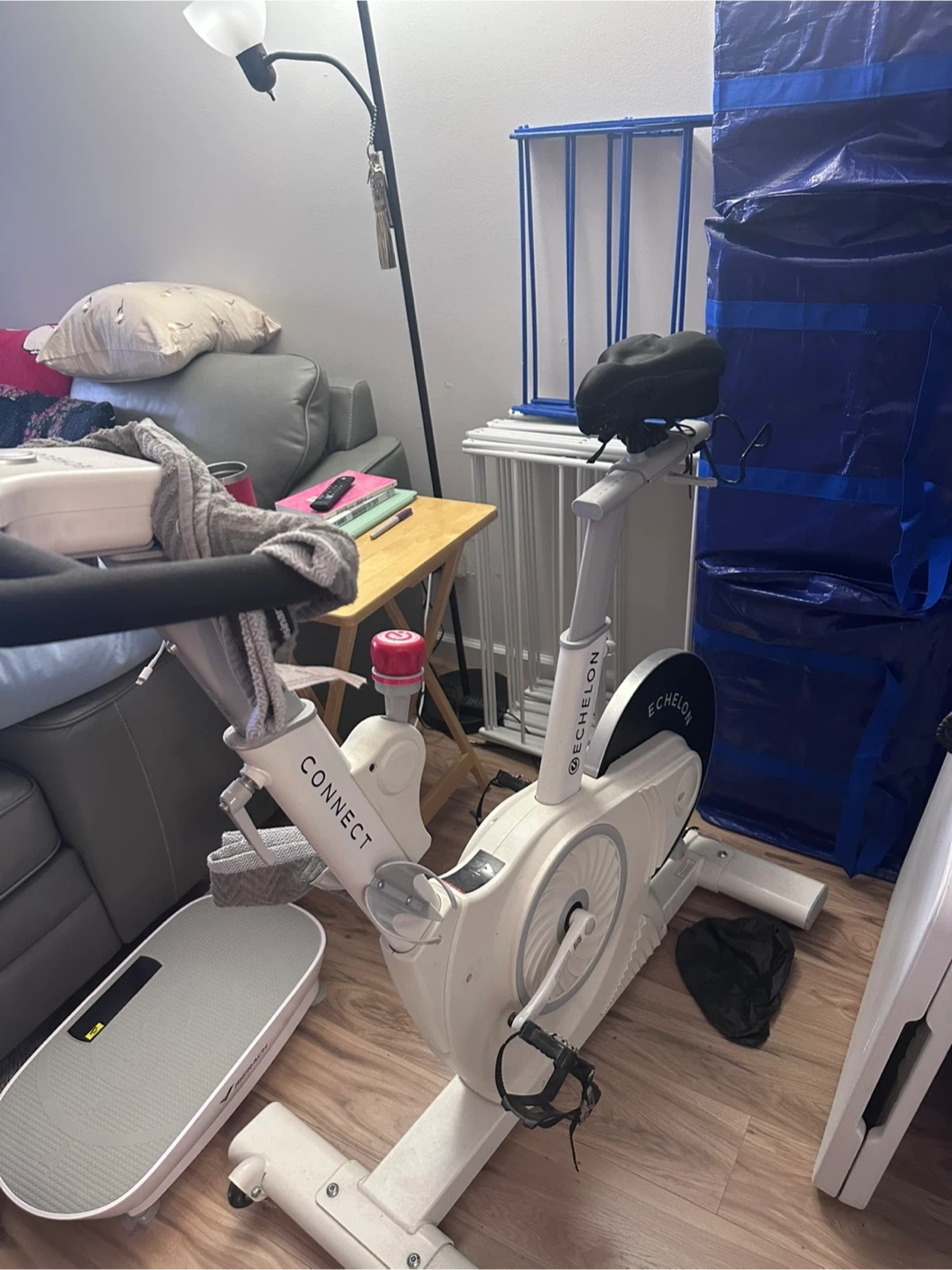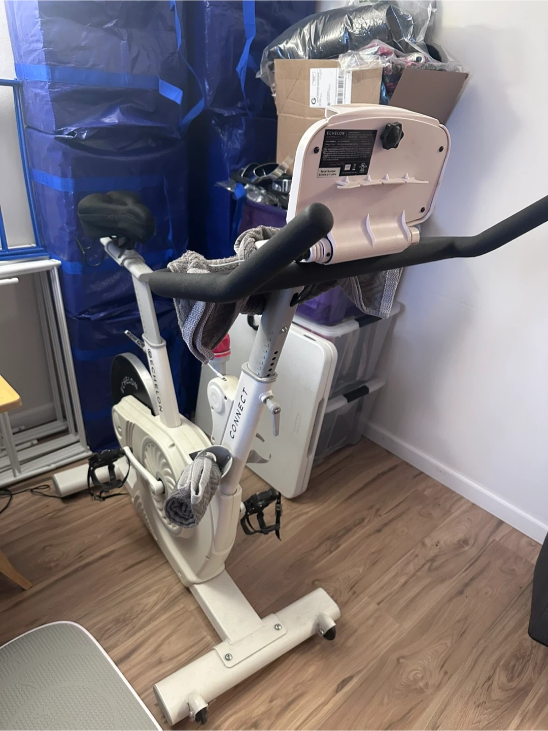 Gently used Echelon Connect EX-3 Exercise Bike with removable seat, foot pedals (so you can ride with clips if you prefer) and adjustable handle bars.