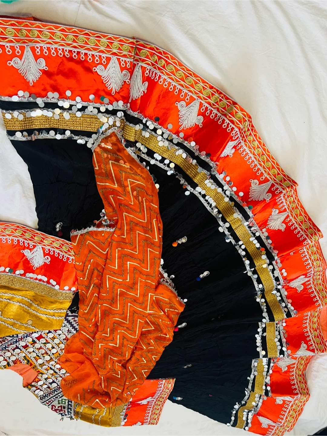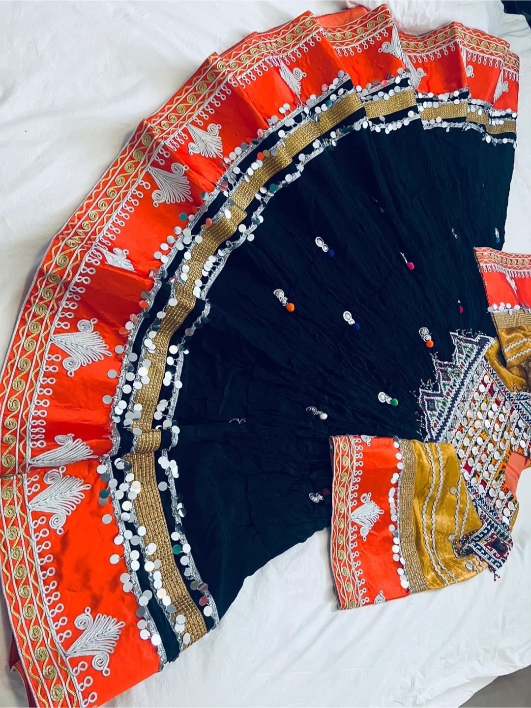This is a beautiful black Afghan dress adorned with vibrant orange embroidered trim. It features intricate beadwork and sequin embellishments throughout. The set includes the dress and matching sleeves. It's perfect for cultural events or festive occasions!