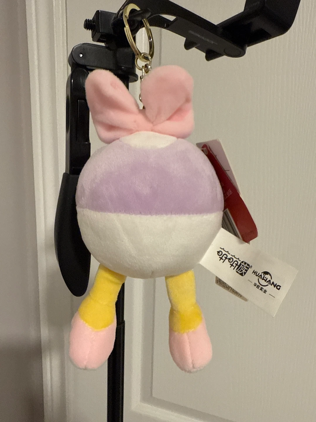 A cute plush keychain featuring Daisy Duck. It's purple, white, yellow, and pink with a bow. Great for adding to bags or keys!