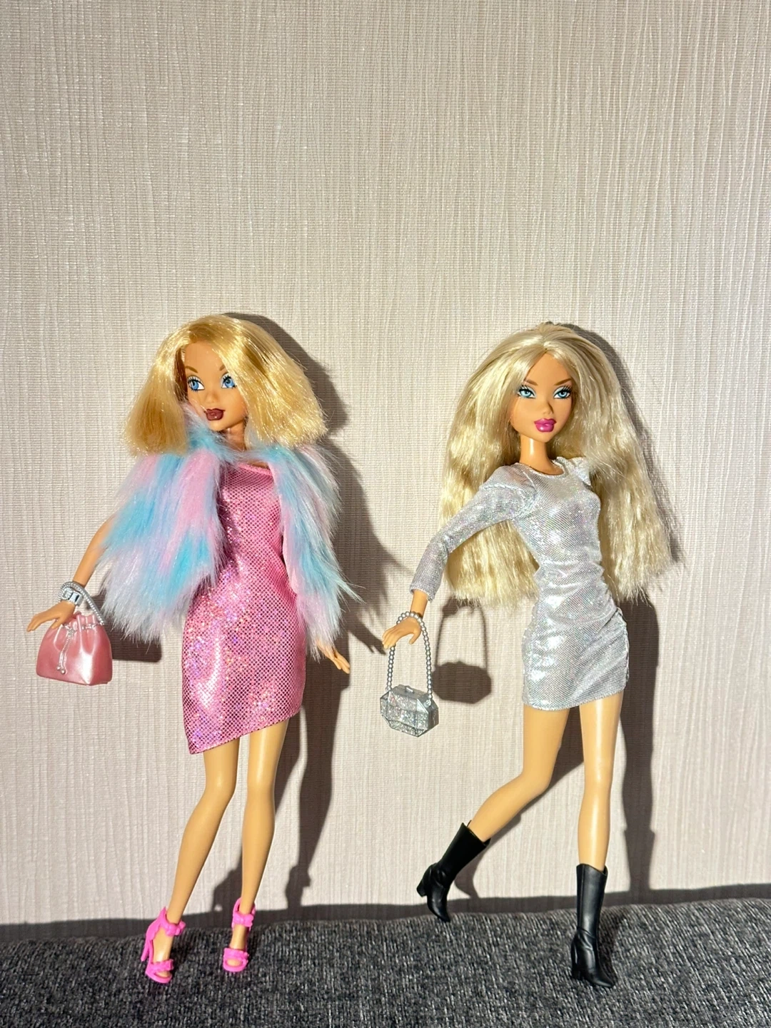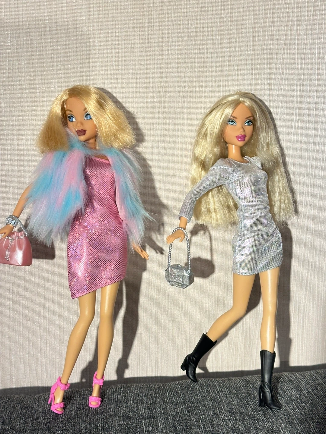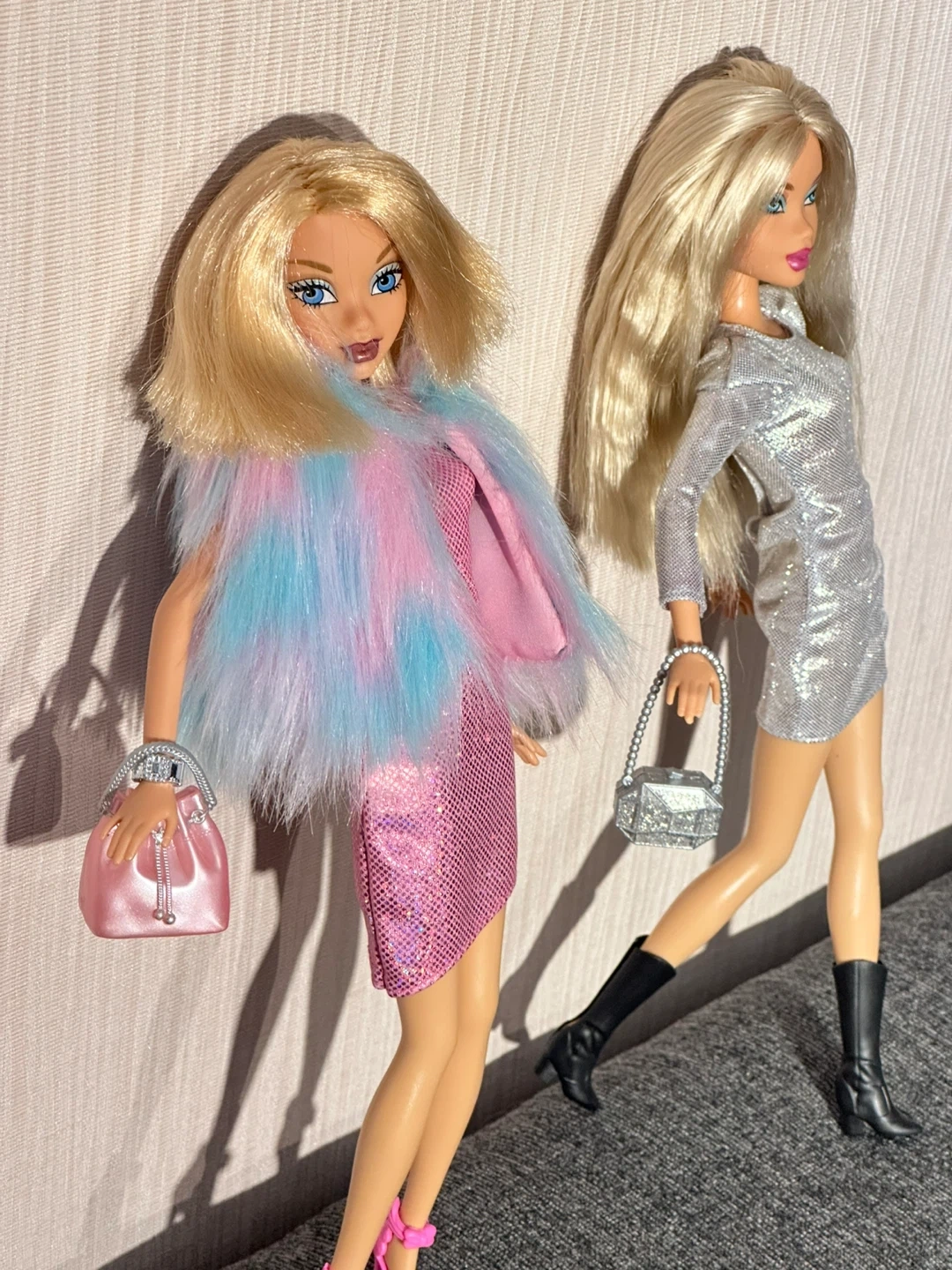 Two My Scene fashion dolls dressed in sparkly outfits. One doll wears a silver sequined dress with black boots and a matching purse. The other doll sports a pink glitter dress with a fluffy pink, blue, and purple boa and a pink purse. It's playtime fashion fun!