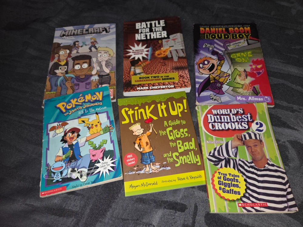 This bundle includes 6 children's books. Titles are Minecraft, Battle for the Nether, Daniel Boom Loud Boy, Pokémon: Johto Journeys, Stink It Up!, and World's Dumbest Crooks 2. They're great for young readers interested in adventure and humour.