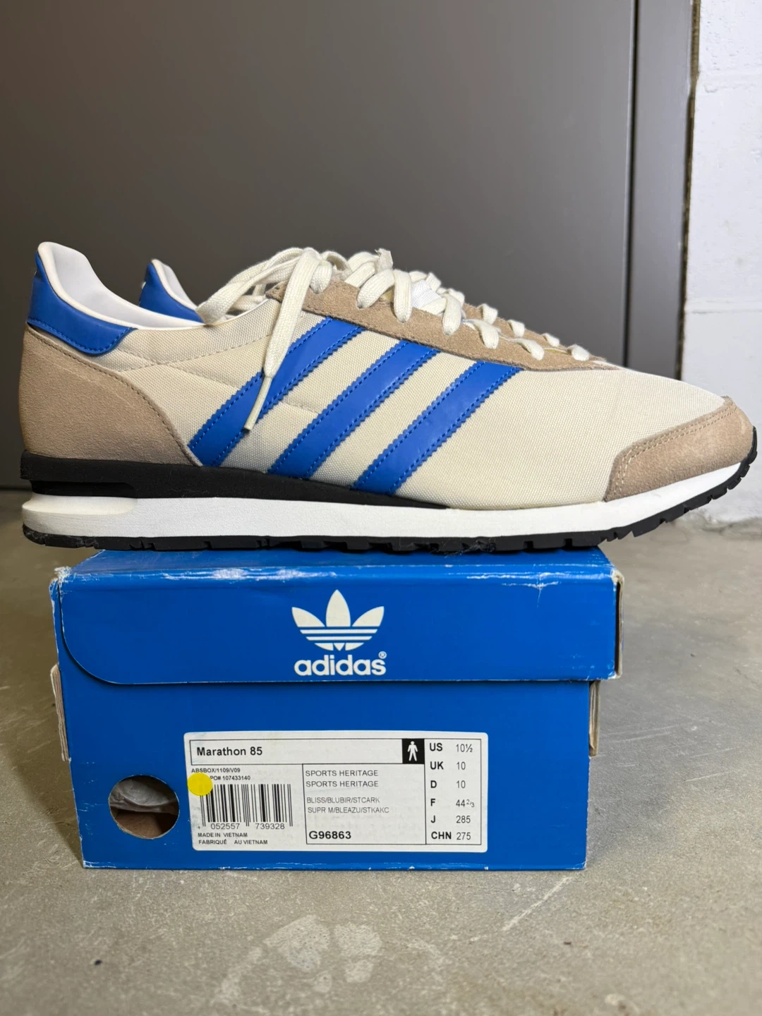 Adidas Marathon 85 "Sports Heritage" sneakers in a beige and blue colourway. These shoes come with their original box and extra black laces. They feature a classic retro design perfect for everyday wear. Wear once. Super clean.