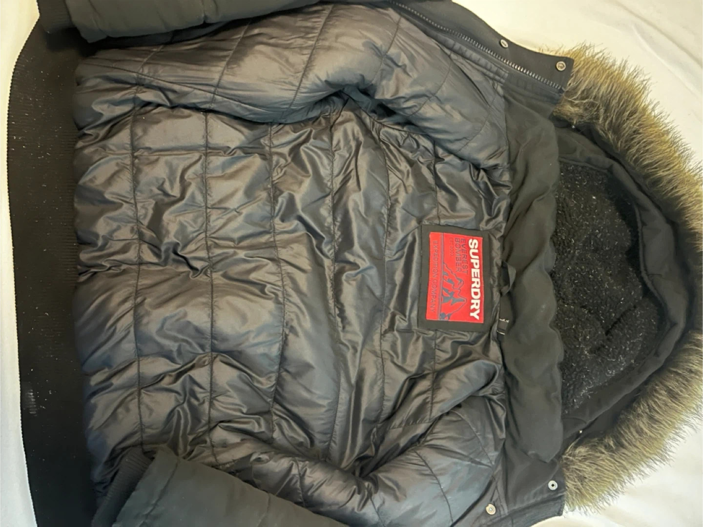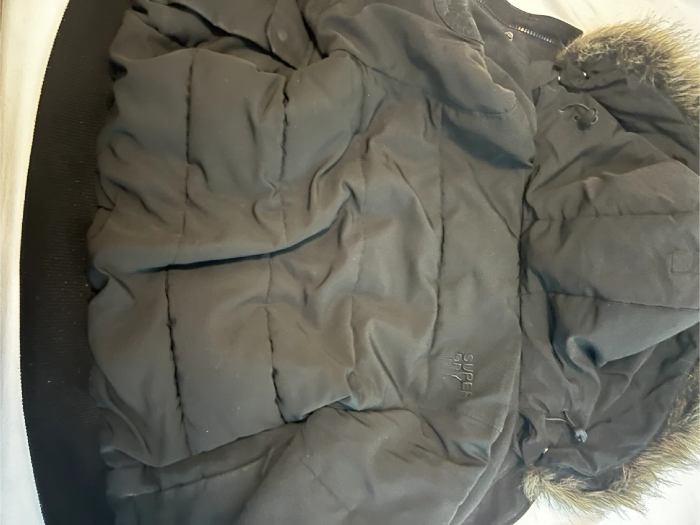 Black puffer jacket from Superdry. Features a faux fur lined hood and quilted interior. Durable construction for cold weather. Great for everyday wear!