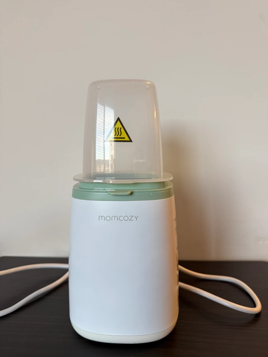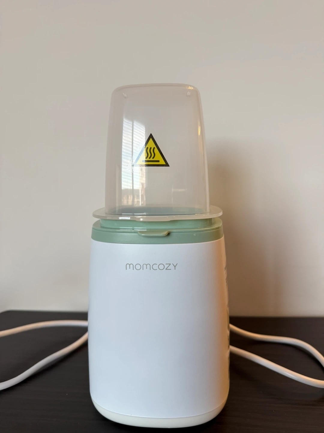 This is a Momcozy baby bottle warmer. It's white and green with a clear lid. It has a safety warning symbol on the lid.