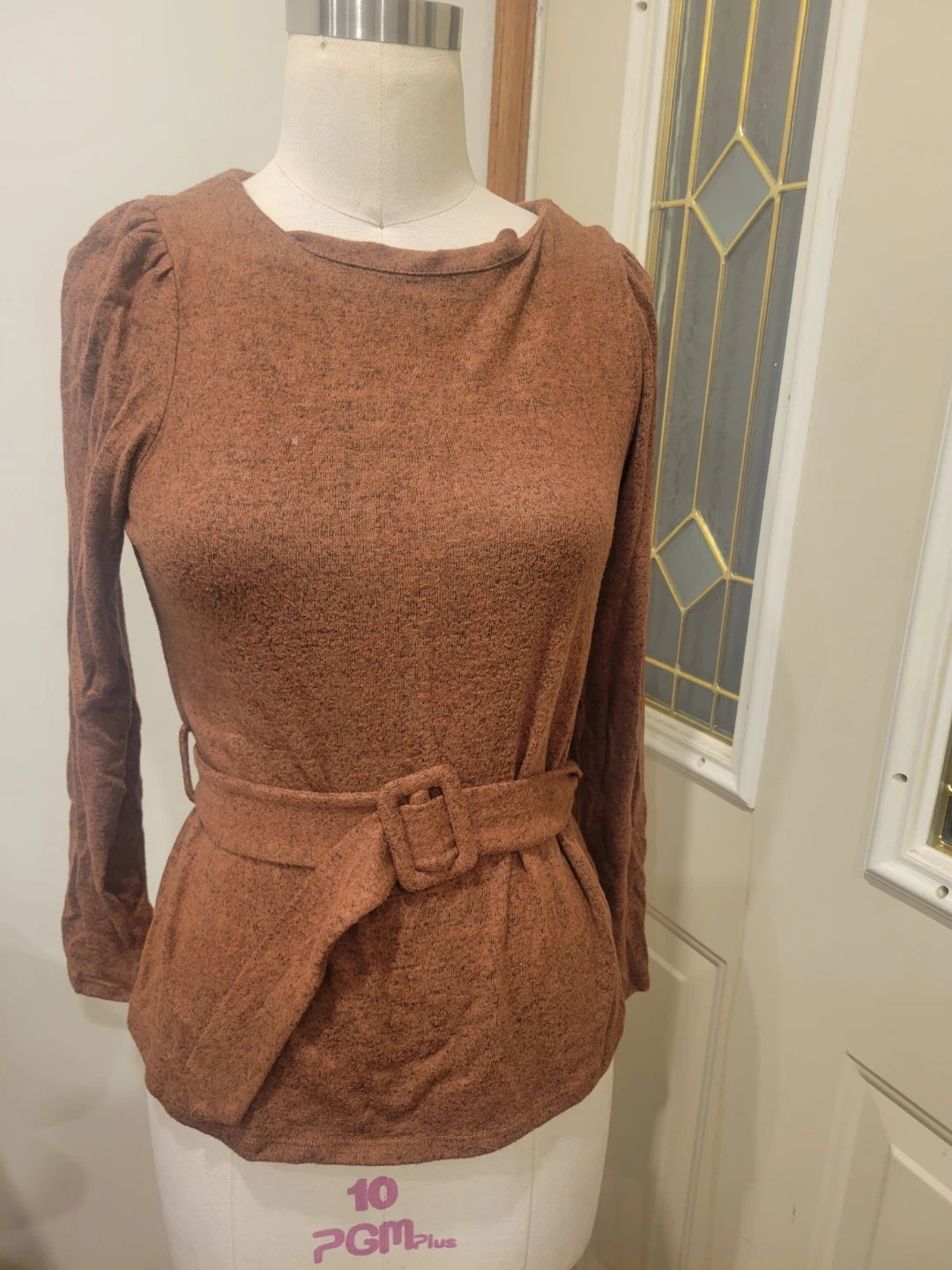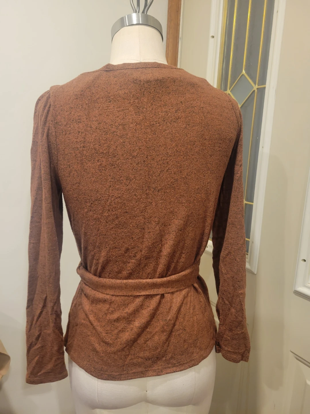 This Monteau top features long sleeves and a flattering wrap style. It's made from a soft, textured fabric. Size is small with removable belt has a small mark can see in last picture pickup location eglinton and dufferin area