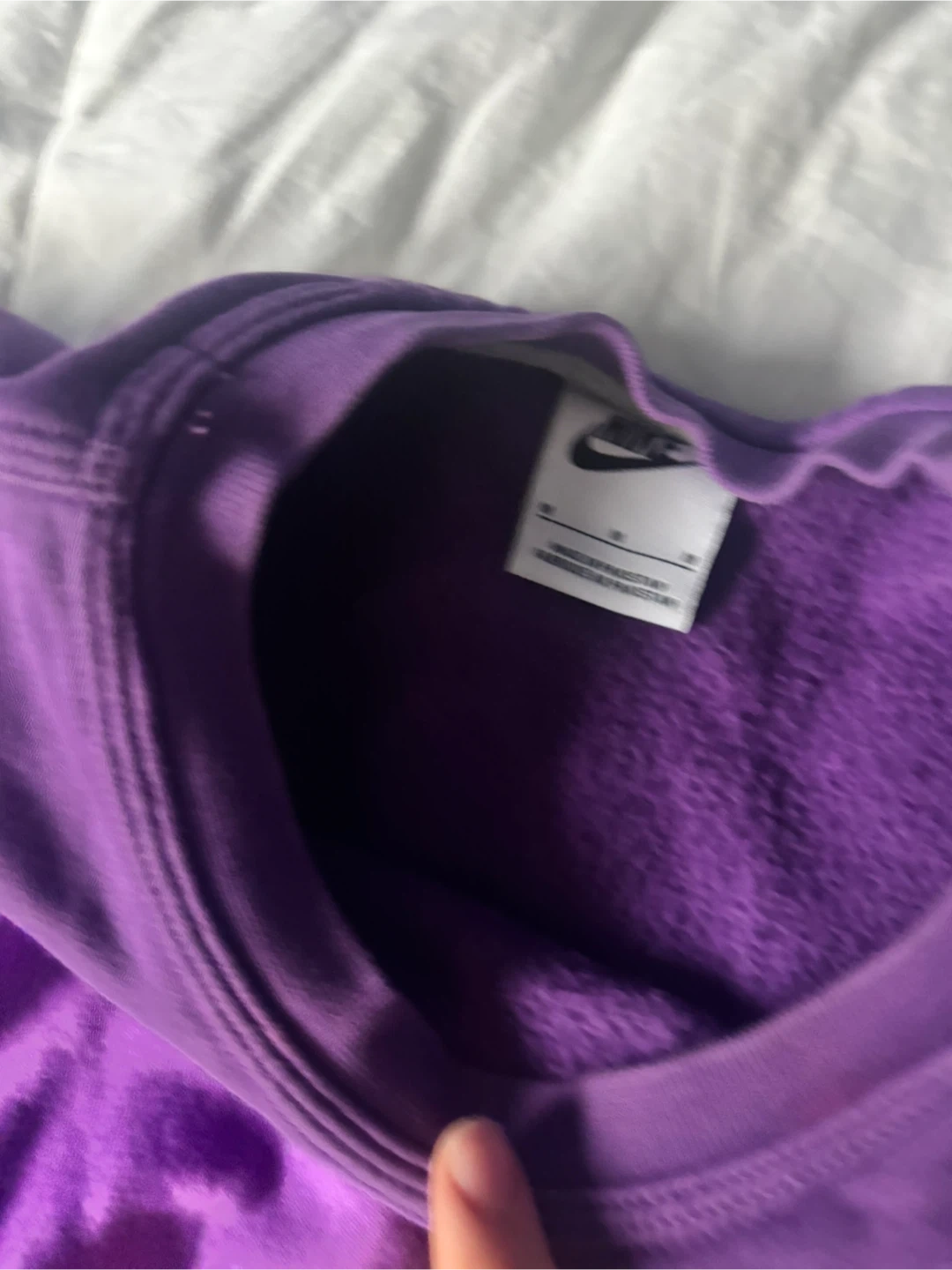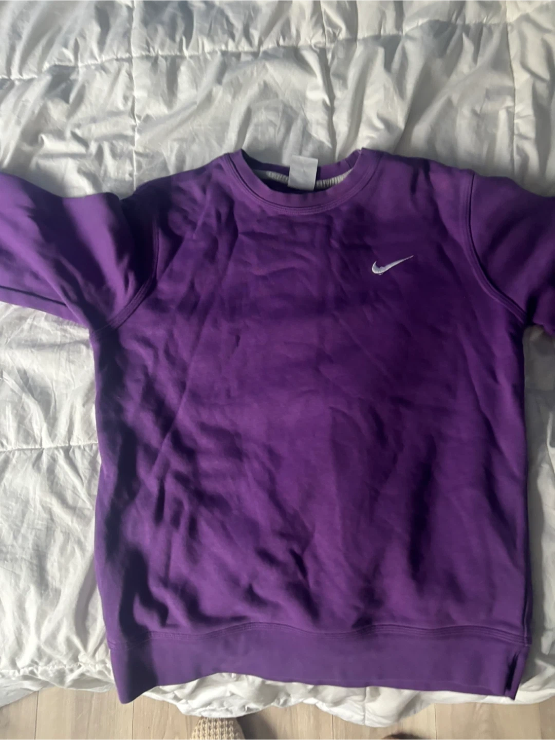 This is a Nike crewneck sweatshirt in a vibrant purple colour. It's made of a comfortable blend, perfect for everyday wear. Size is M.
