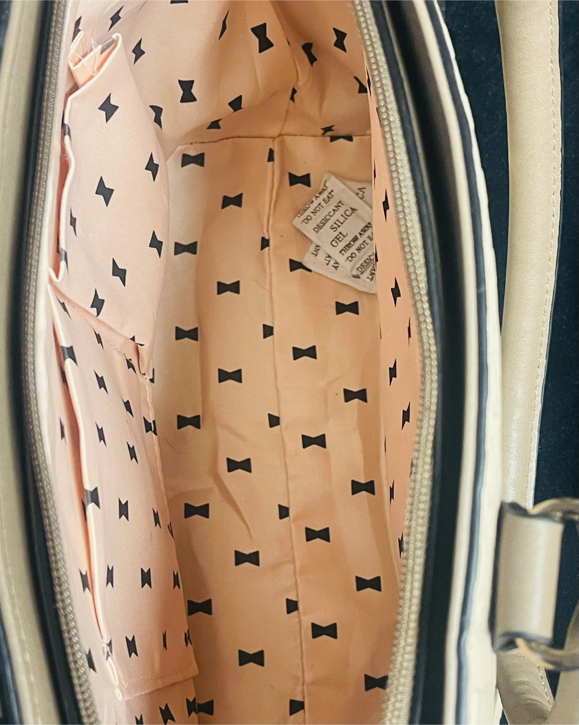 Item Details: This tote has a textured front panel and a zip pocket on the back with Gold zipper and hardware. The interior is lined with a pink fabric featuring a bow pattern and includes internal pockets. It has a classic design that makes it suitable for everyday use.