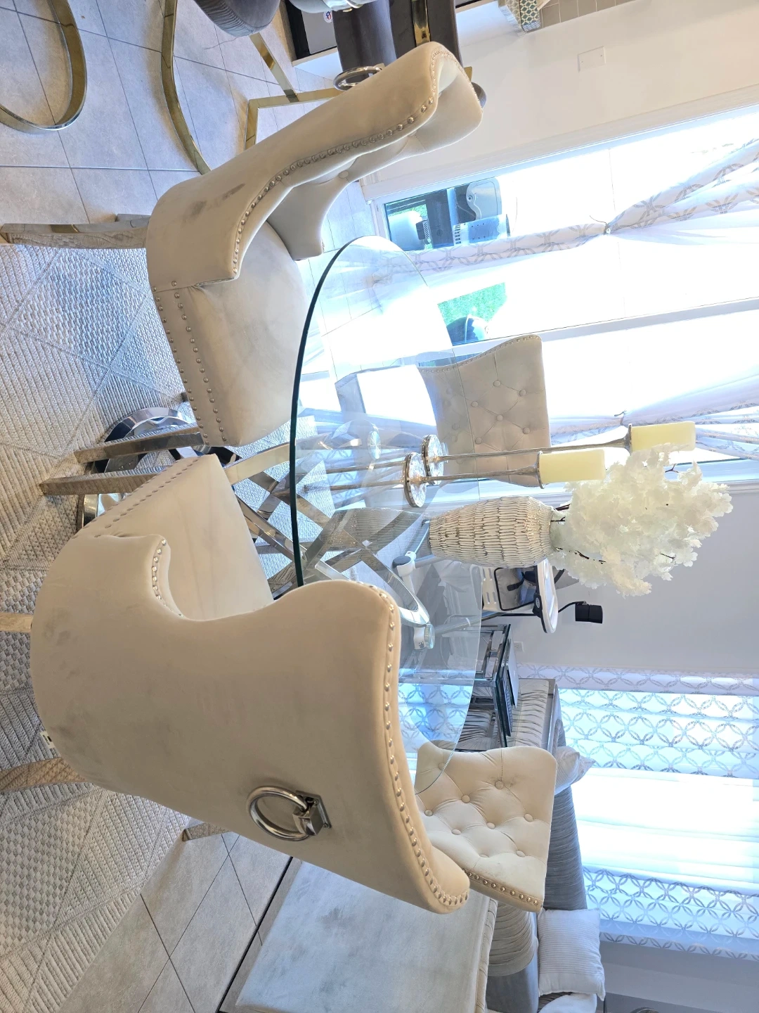 This dining set features a clear glass tabletop supported by a stylish base. It includes four upholstered chairs in a neutral tone, each with decorative studs and a ring pull on the back. The chairs offer comfortable seating with a tufted design.