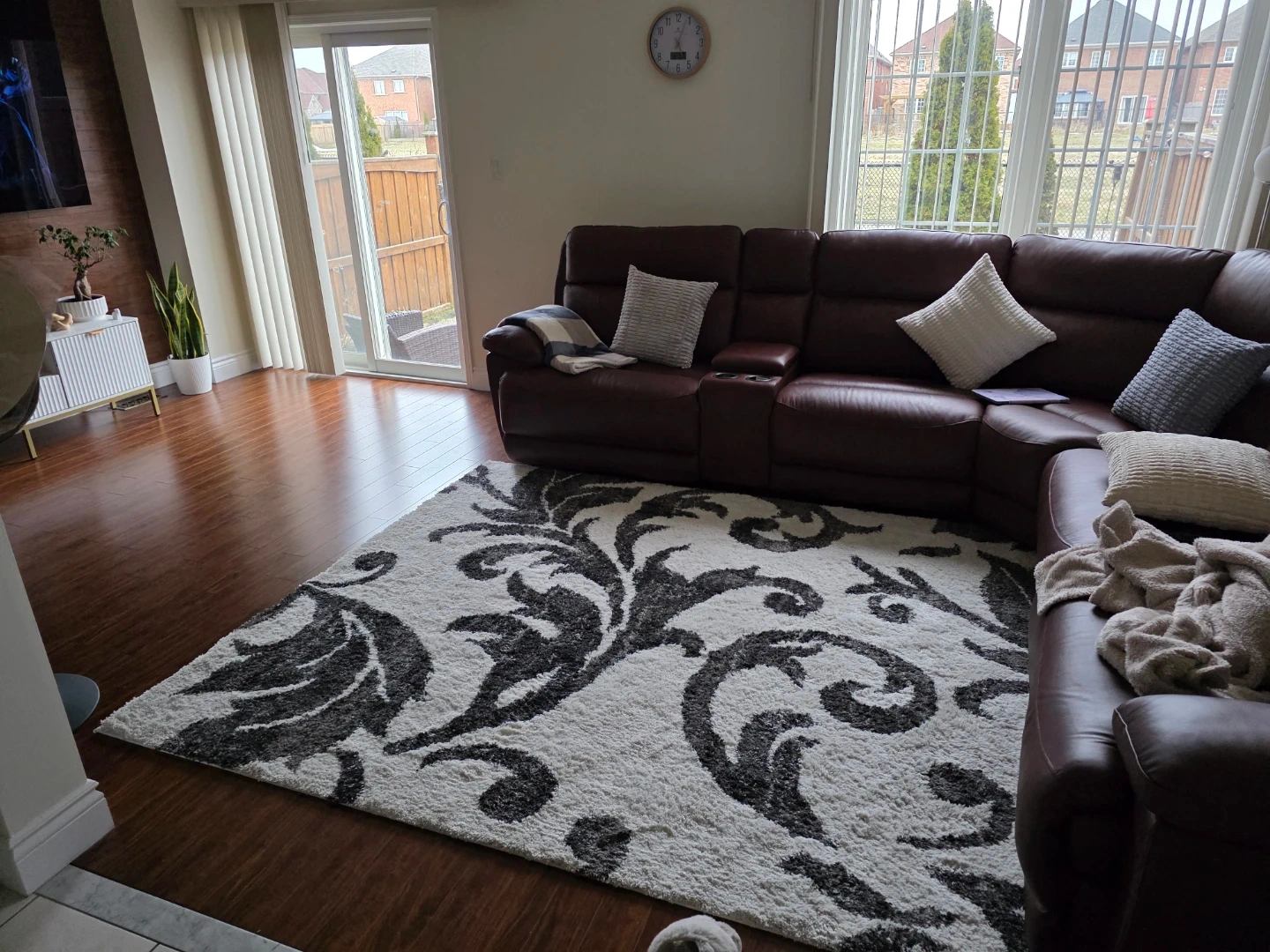 This large area rug features a bold black and white damask pattern. It's soft and shaggy, adding comfort and style to any room. Adds a modern touch to your living space!