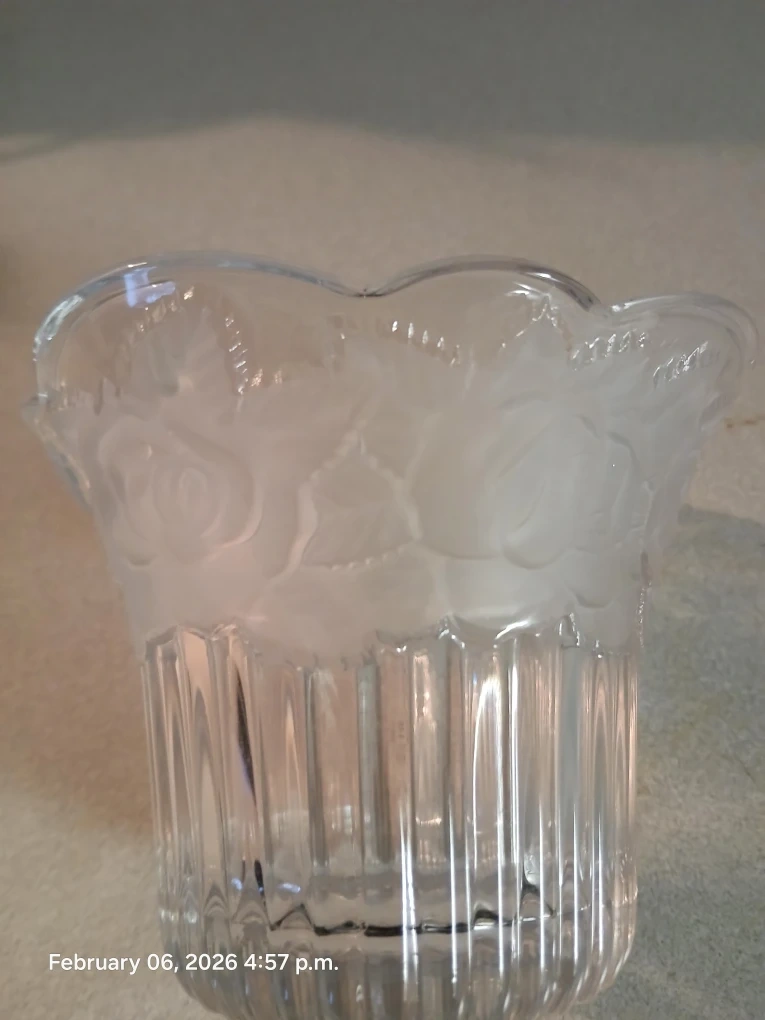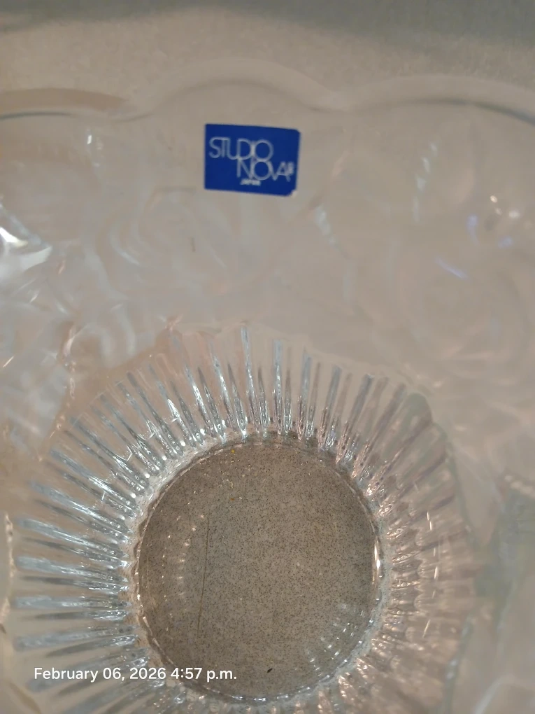 This Studio Nova candy dish features a frosted rose design on clear glass. It has a fluted base and a scalloped rim. Perfect for adding a touch of elegance to your home decor! 🏆
