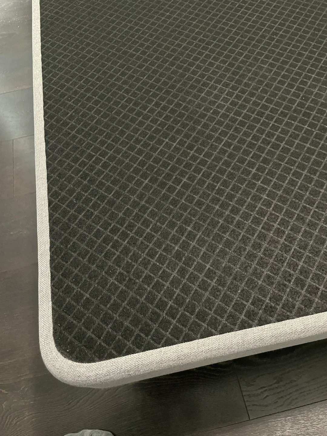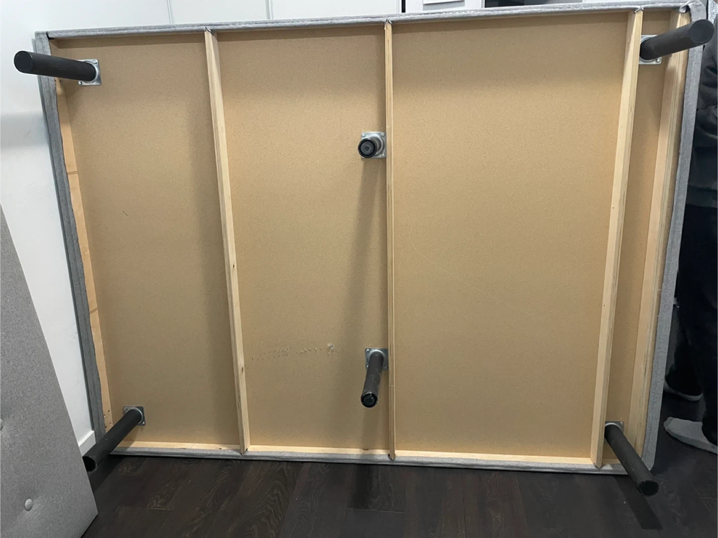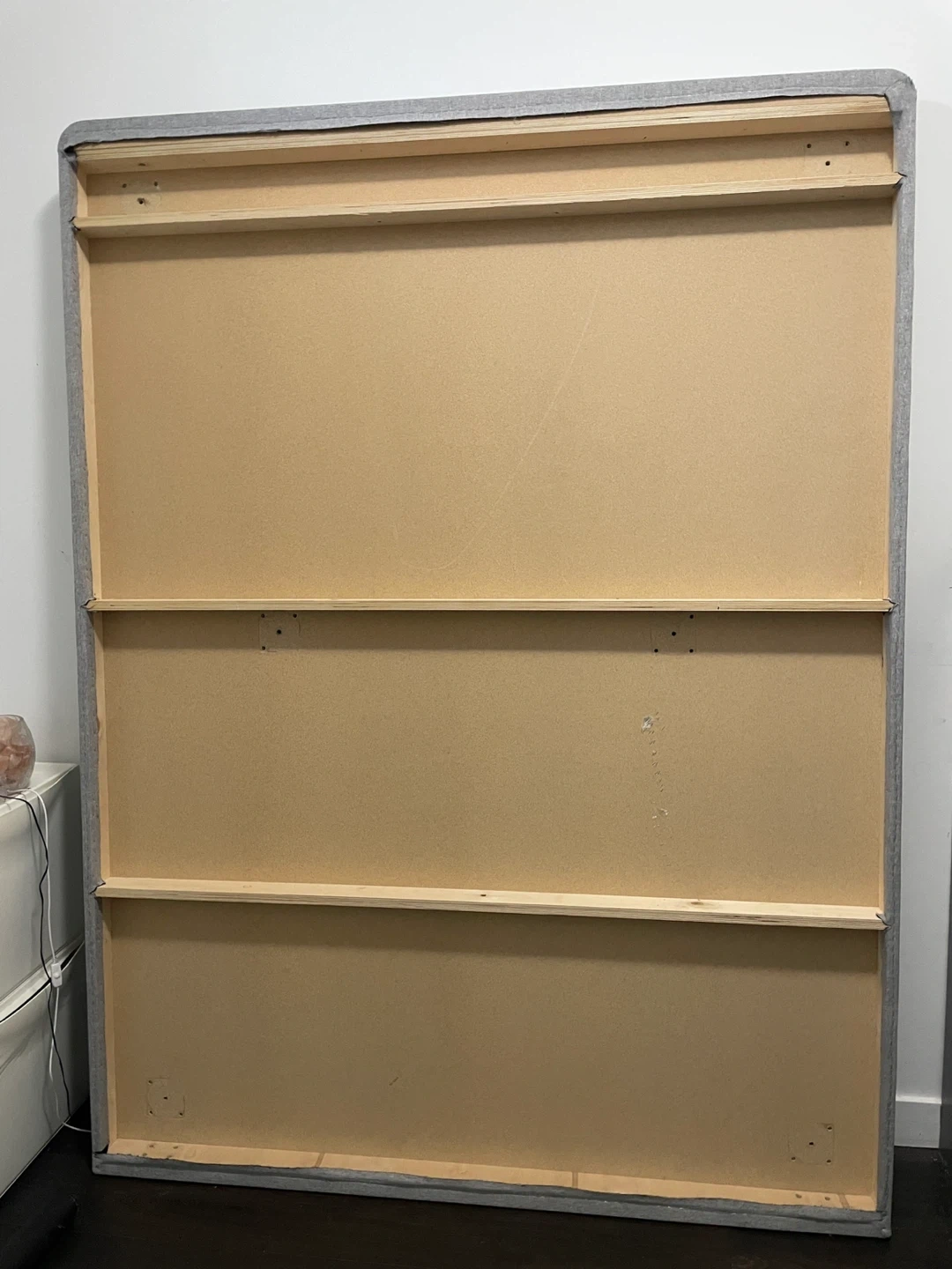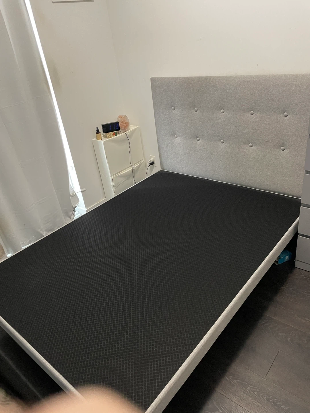 Grey tufted upholstered headboard and bed frame. Features a sturdy construction with button tufting on the headboard. Comes with a solid base for mattress support. Both are in very good condition
