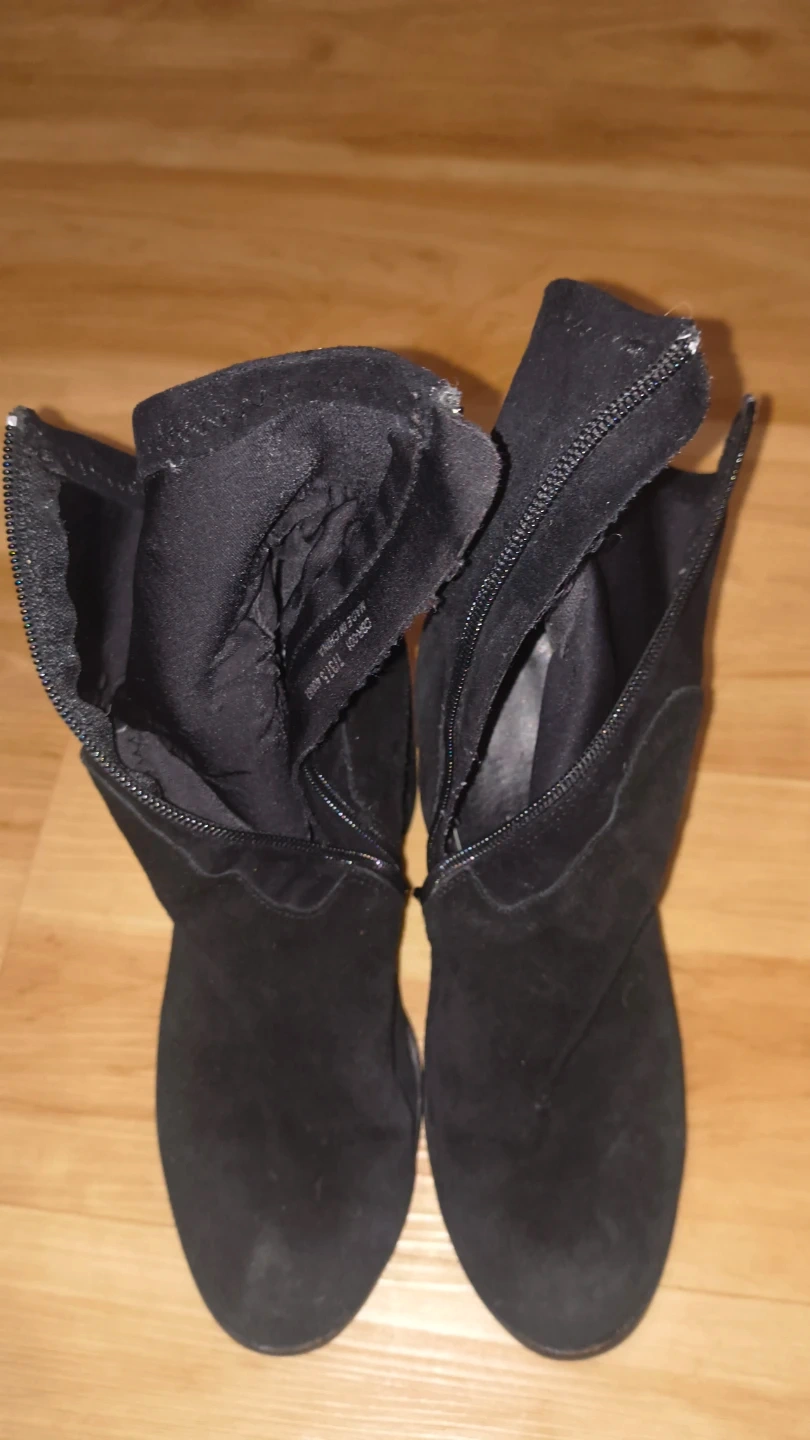 These are black suede boots. They have a side zipper closure for easy on and off. The heel is a block style.