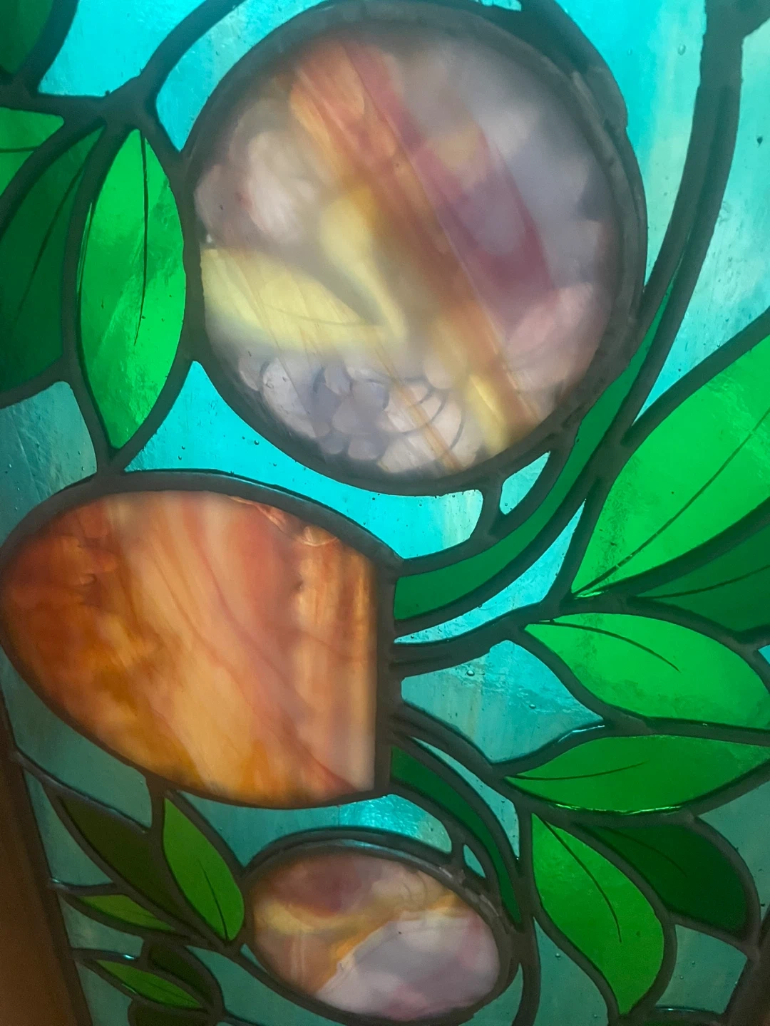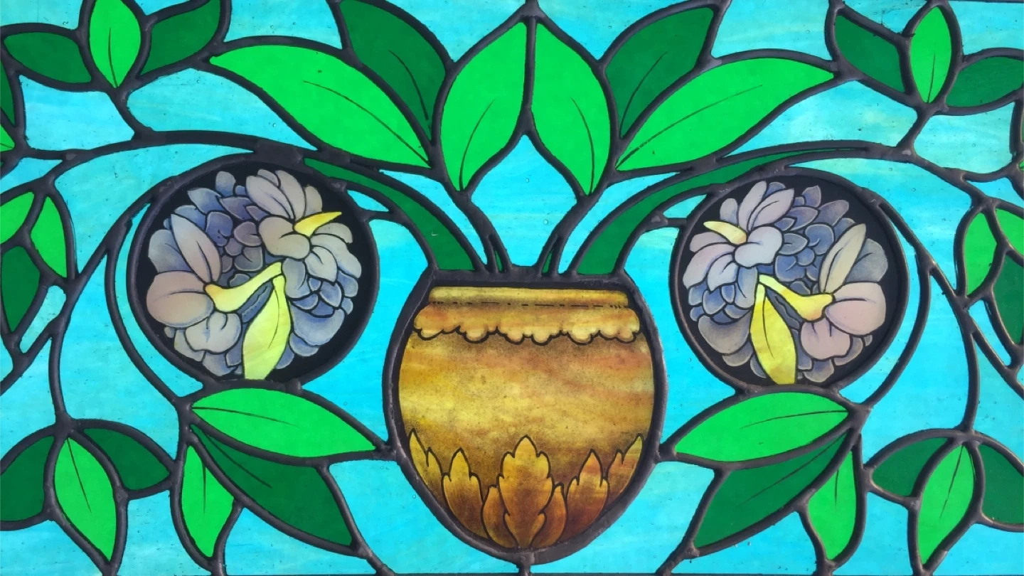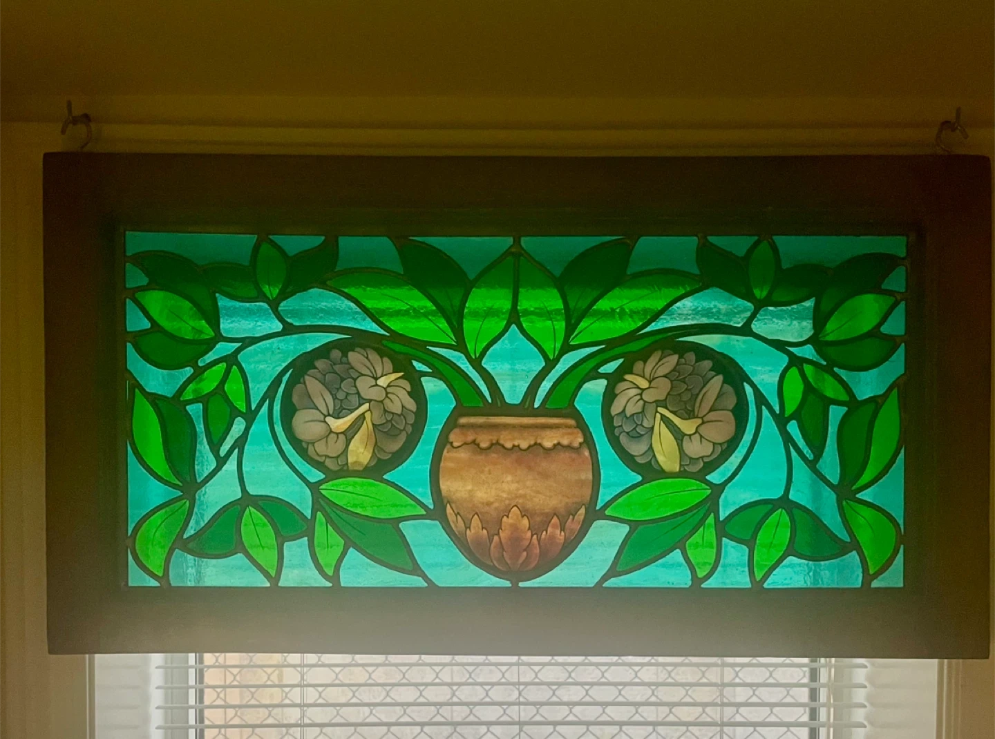 This decorative stained glass panel features a floral motif with a vase of flowers in the centre. The glass has a beautiful mix of green, blue, and amber hues. It's framed in wood and has 2 hooks for hanging. 3 pieces of glass back plated to enrich the colours.