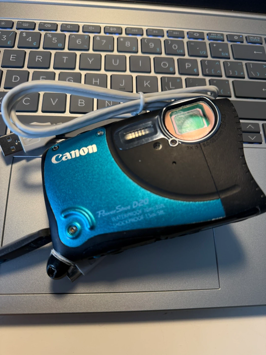 Canon PowerShot D20 digital camera in blue. It's waterproof up to 10m, shockproof, and freezeproof. Includes original box and USB cable.