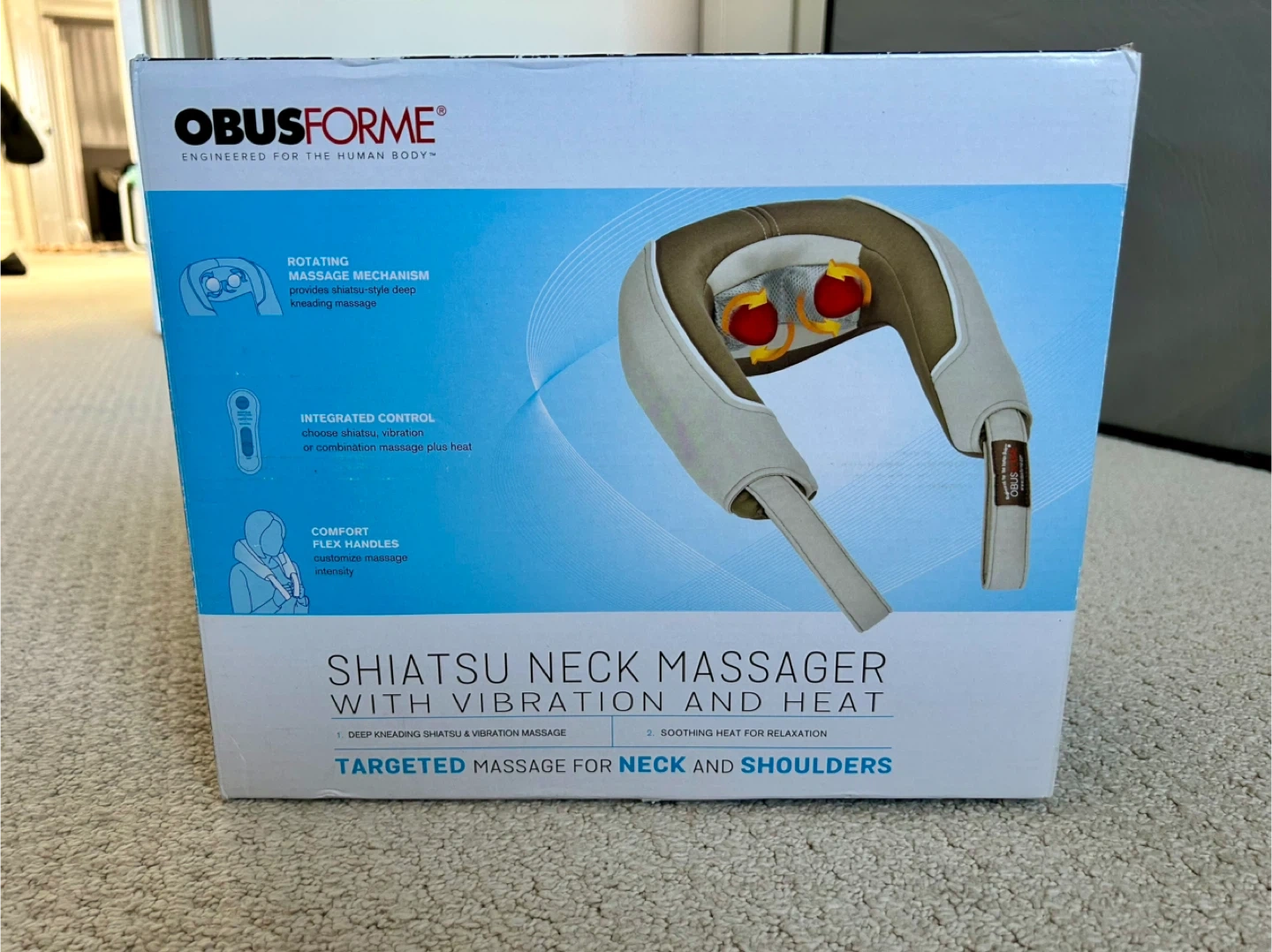 This Obusforme neck massager features a rotating shiatsu massage mechanism for deep kneading. It has integrated controls for vibration and heat, plus comfort flex handles to customize intensity. It's designed for targeted massage on the neck and shoulders.