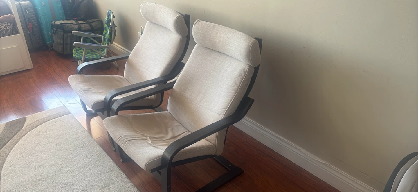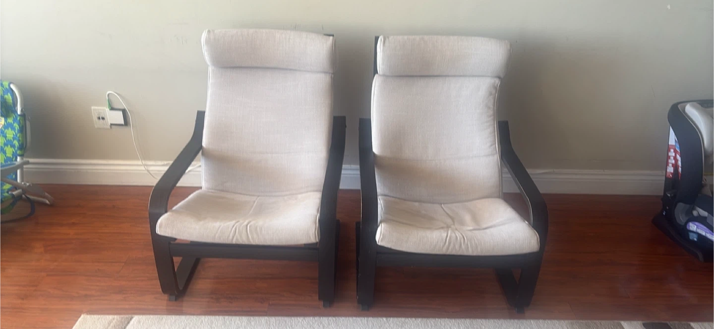 Selling two matching IKEA Poäng chairs. Light beige fabric upholstery with dark wood frame. They're comfy and stylish!