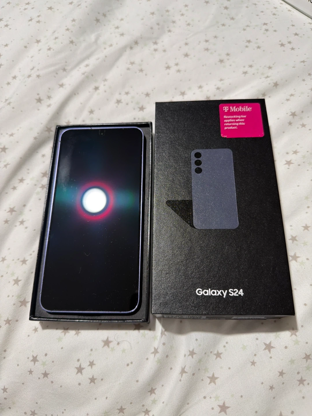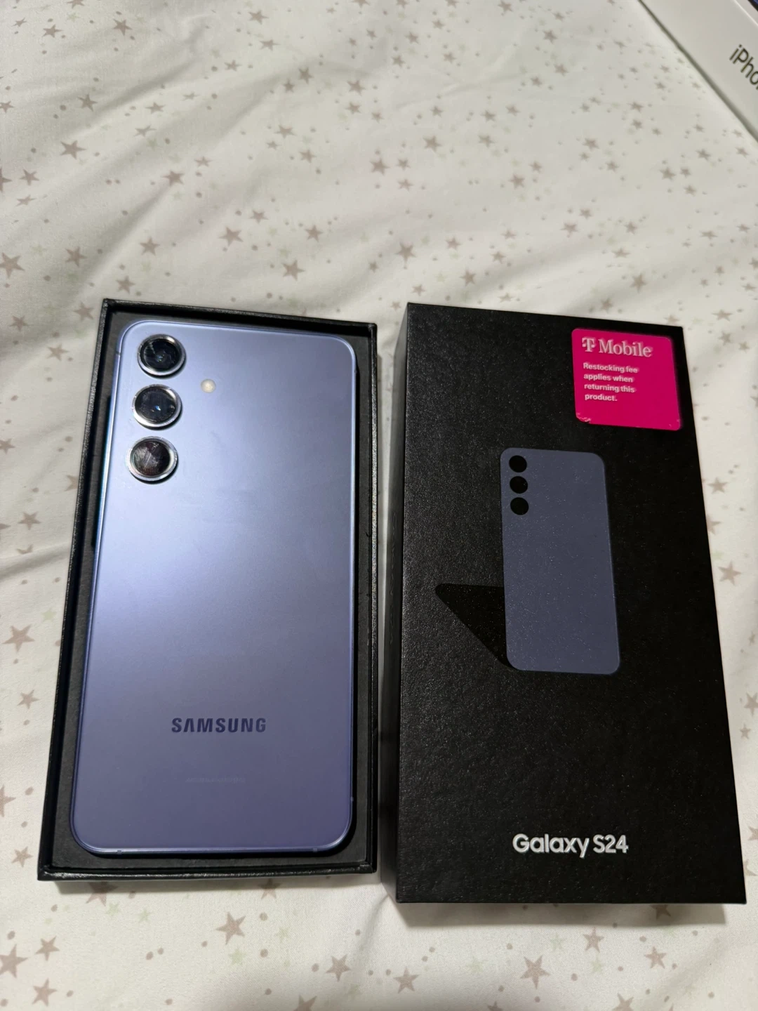 Samsung Galaxy S24 smartphone in a lavender color. It comes in its original box. This device is from T-Mobile. Excellent condition