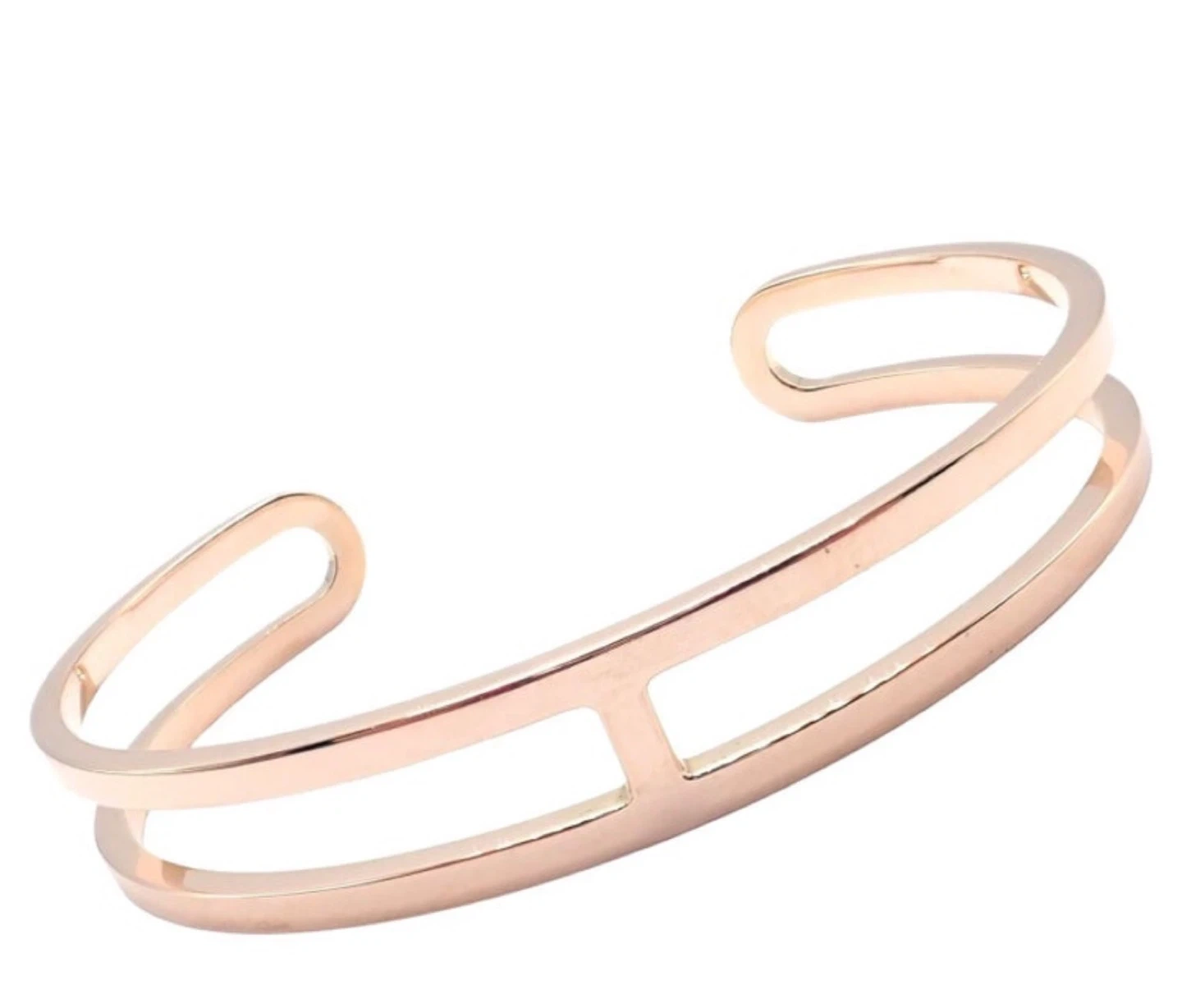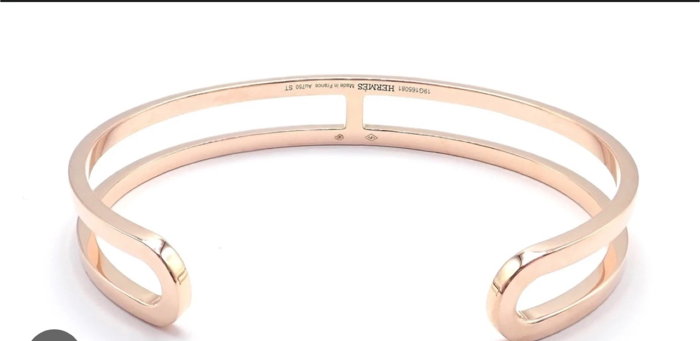 This is a stylish Hermes cuff bracelet. It's made of rose gold-plated metal. The design features a unique "H" shape detail. I have the receipt too.