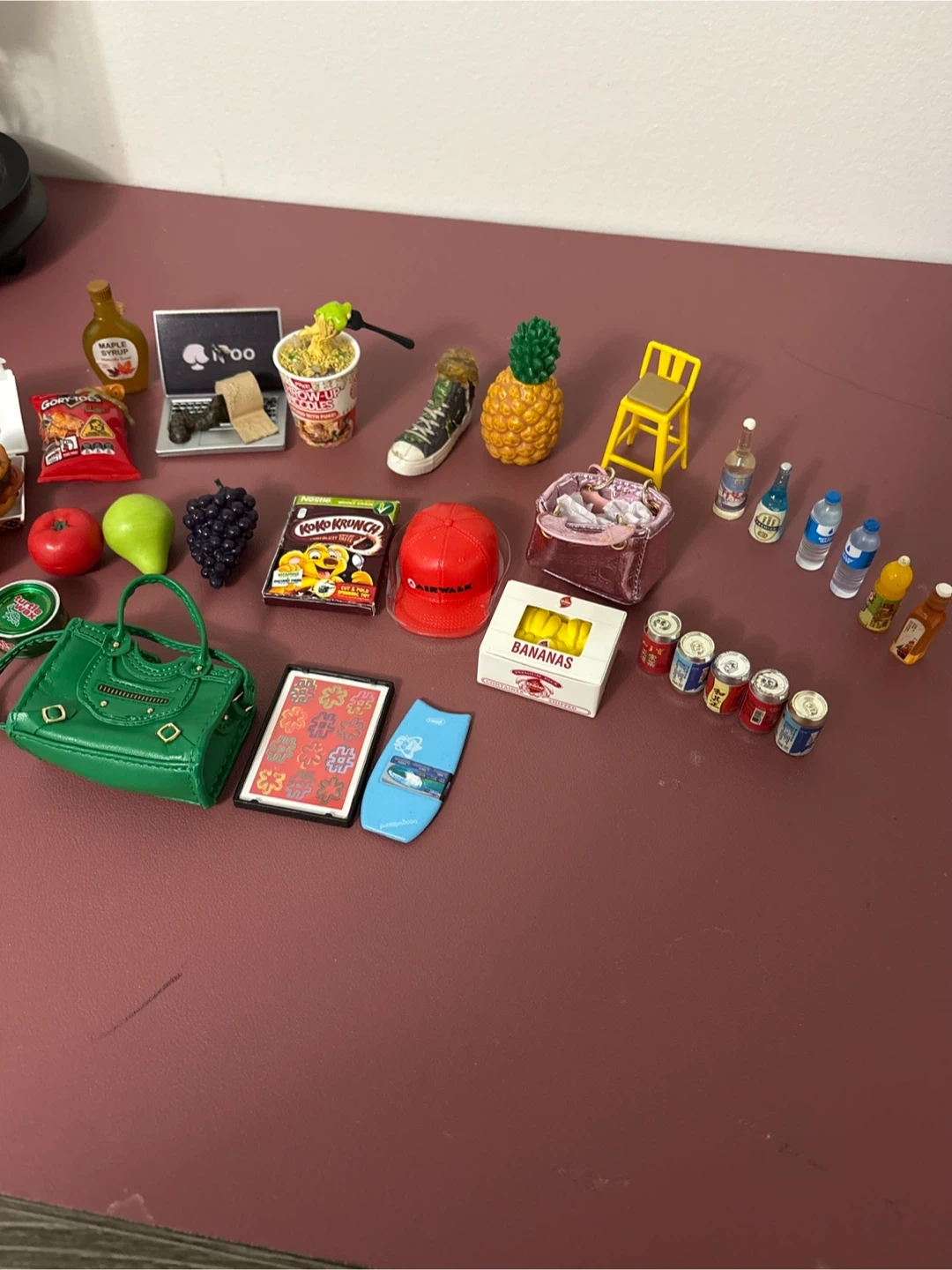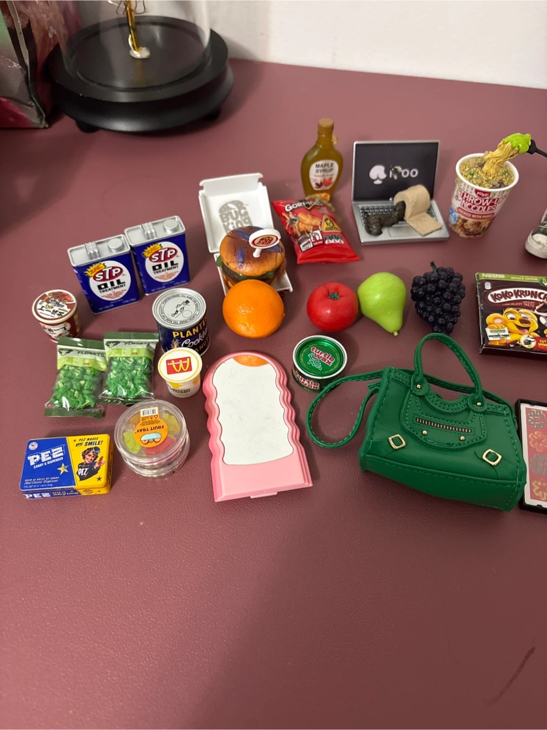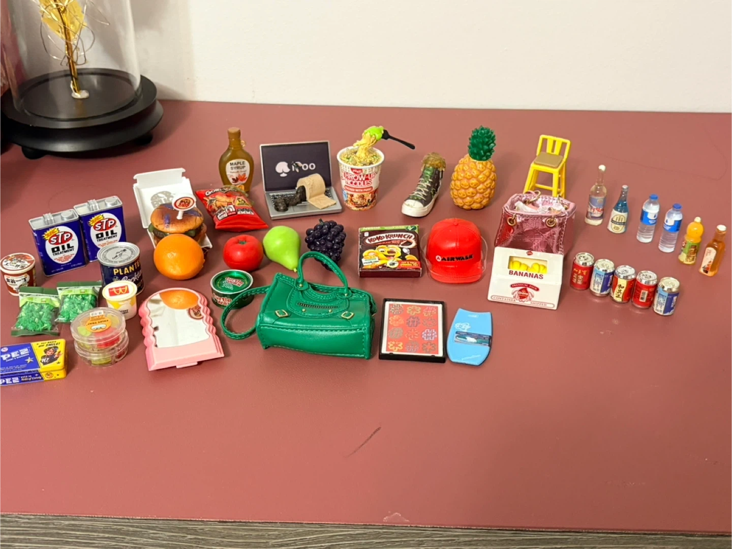 A fun collection of miniature items, perfect for dollhouses or creative displays. Includes various food items, accessories, and decor pieces.
