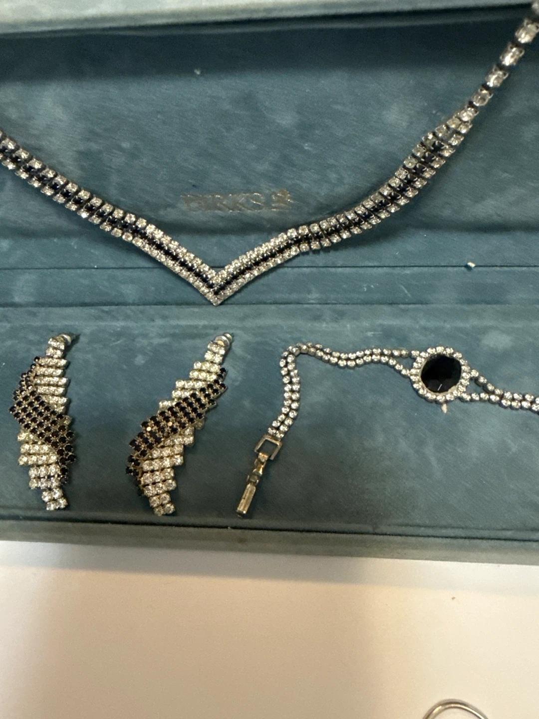 This Birks jewelry set includes a V-neck necklace, a bracelet, and a pair of earrings. All pieces are adorned with clear and black rhinestones, set in a silver-tone metal. The necklace has a distinctive chevron design, and the bracelet features a central black stone.