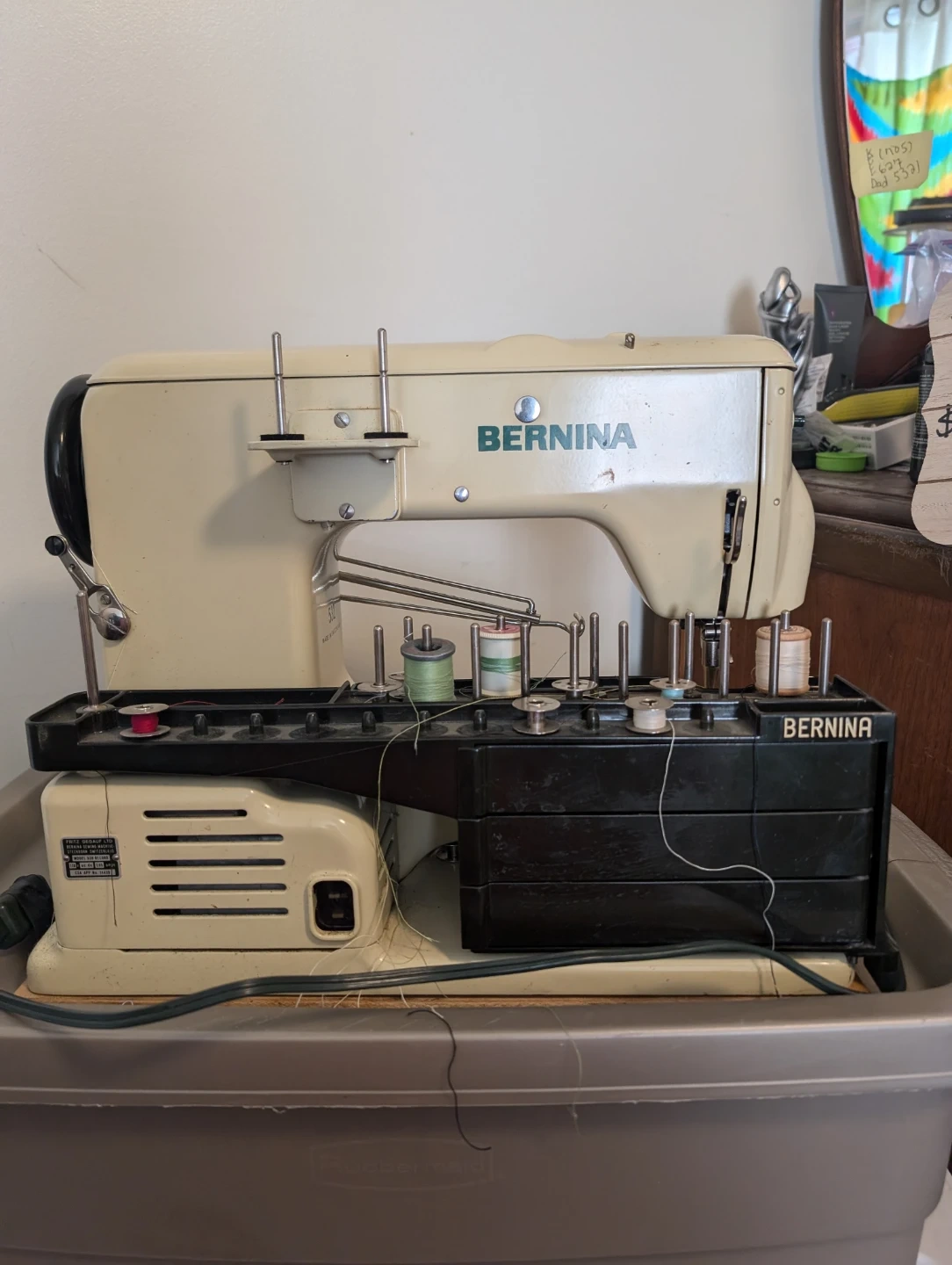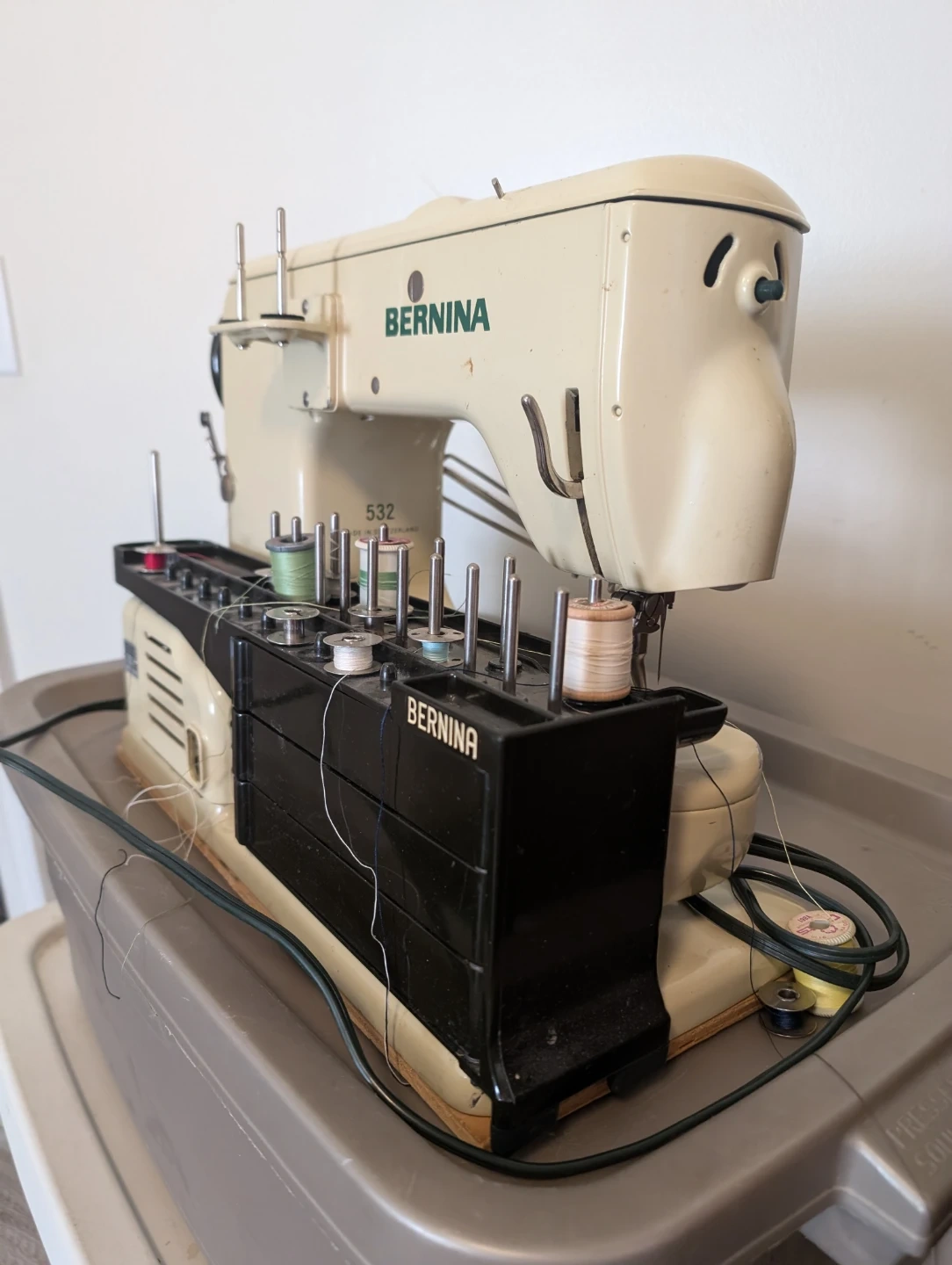 This is a vintage Bernina 532 sewing machine, complete with multiple thread spools. It's a sturdy and reliable machine for all your sewing projects. It's perfect for sewers looking for a classic, durable machine.