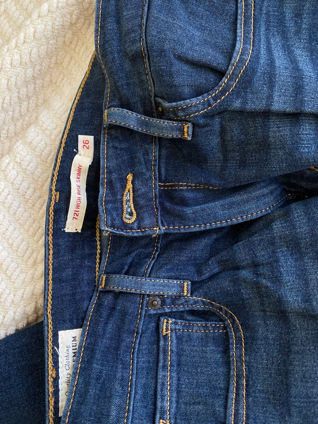 These are Levi's 721 High Rise Skinny jeans in a size 26. They're made of denim material. These jeans are a classic skinny fit, perfect for everyday wear.