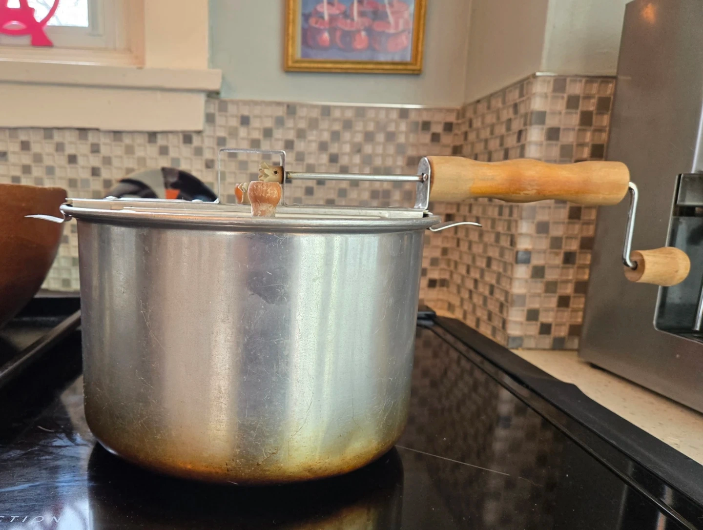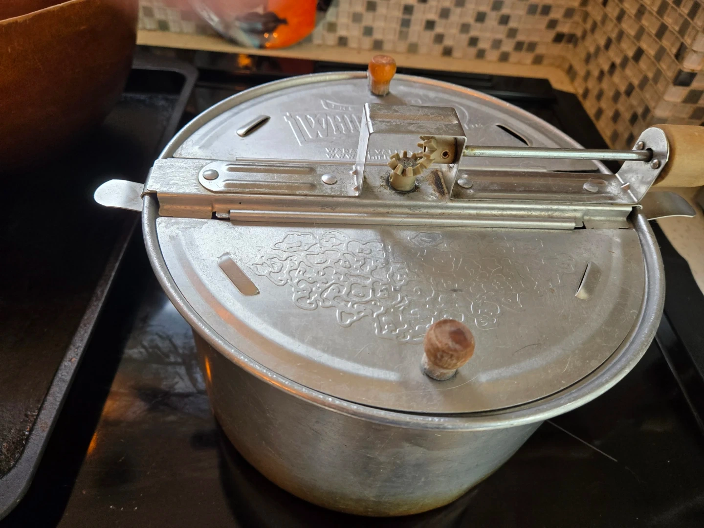 This is a WABASH Brand Whirly Pop stovetop popcorn popper with a crank handle for stirring. It's made of aluminum and has wooden handles. Not for use on induction stoves. Good condition with only a bit of wear. Ready for your next movie night! This popcorn maker makes movie style popcorn and is a hundred times better than microwave popcorn. And safer too! Just take some time to crank, which is kind of like a three minute workout.