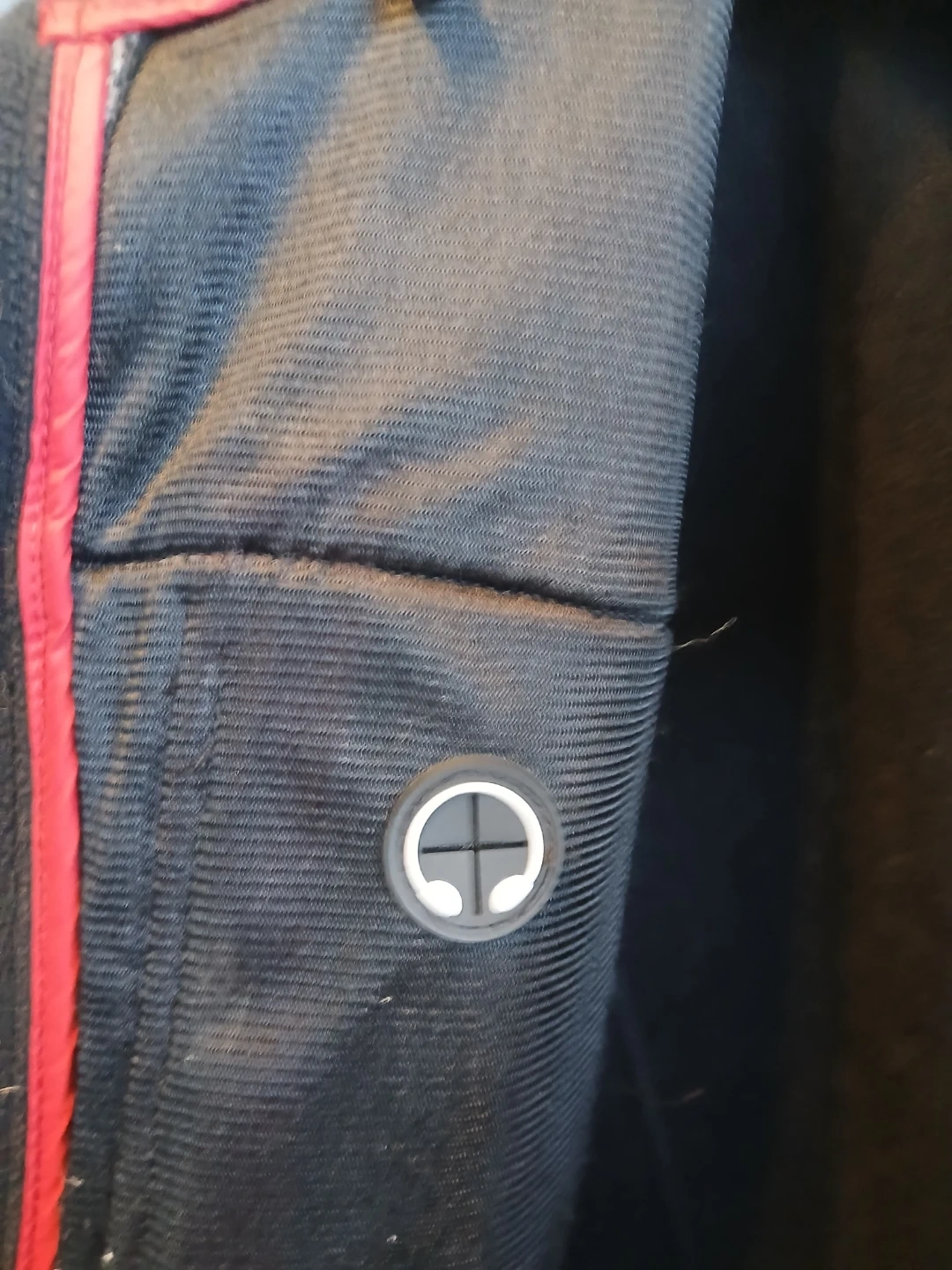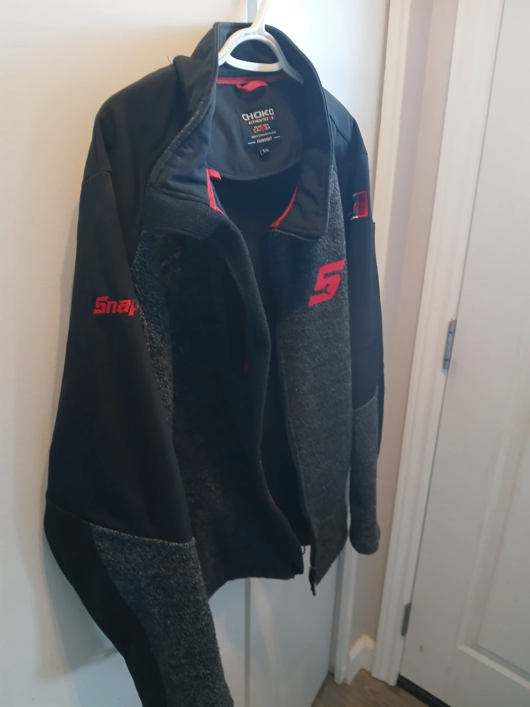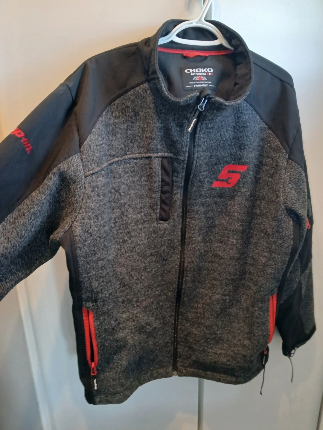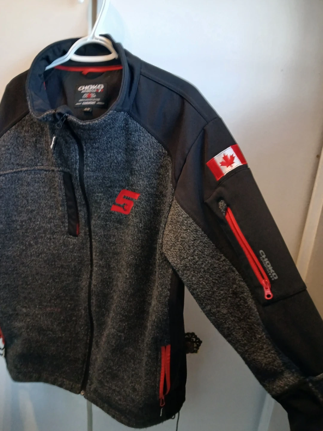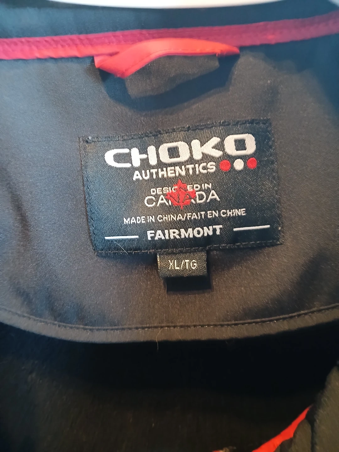 This Choko Authentics jacket is designed in Canada. It's a size XL/TG with black and grey colouring and red accents. This jacket is perfect for keeping warm.