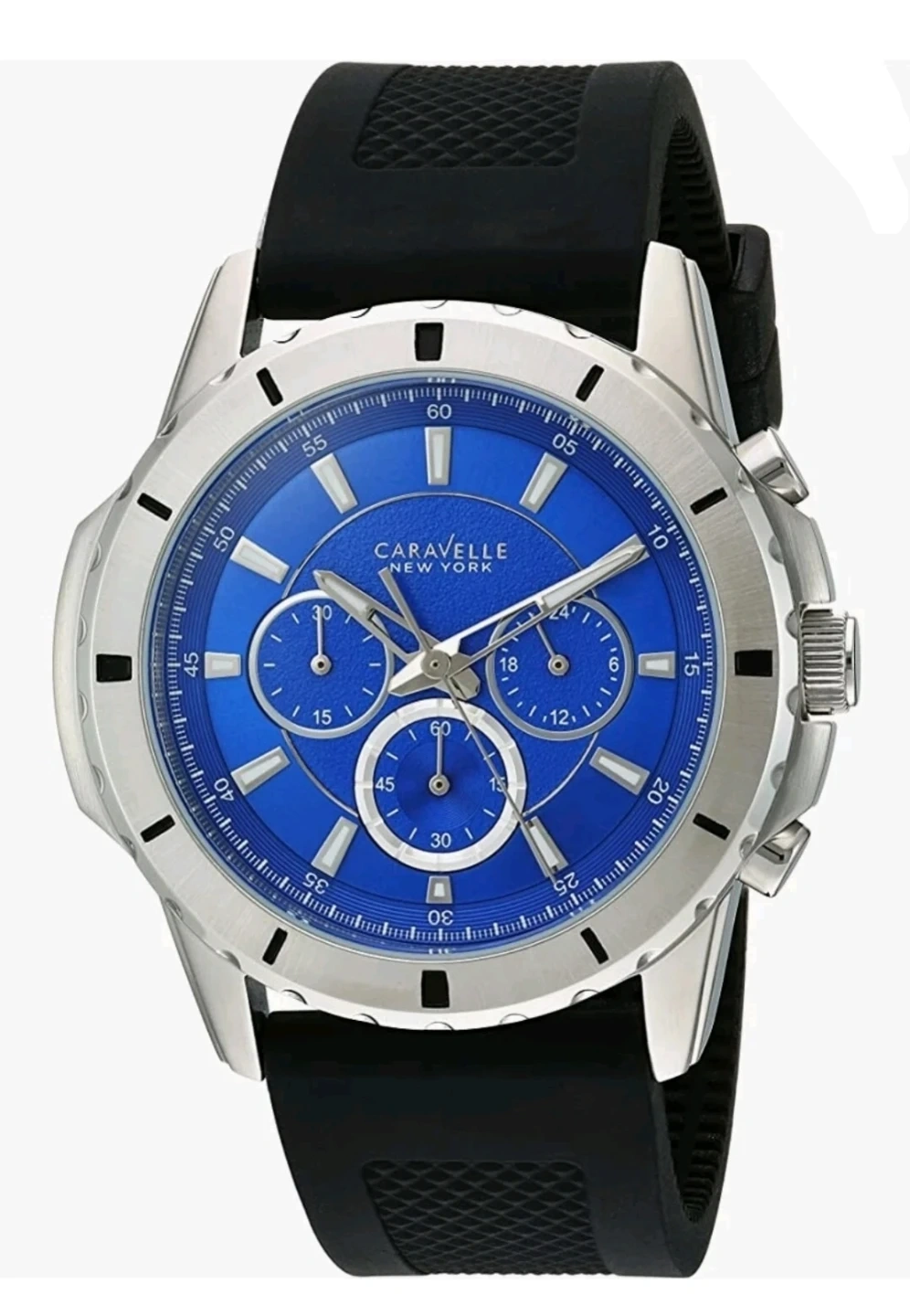 Rugged sport styling meets everyday luxury with this Caravelle by Bulova men’s chronograph watch. A bold navy blue dial, stainless steel case, and durable silicone strap make this a sharp everyday timepiece with premium appeal.