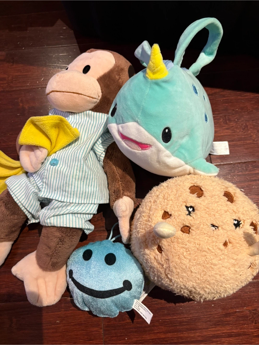 Selling a cute collection of plush toys! Includes a monkey in pajamas, a blue narwhal, a cookie plush, and a blue smiley face plush. Perfect for kids or collectors!