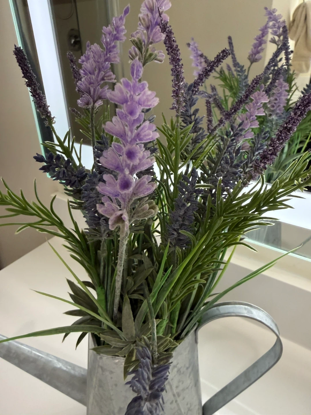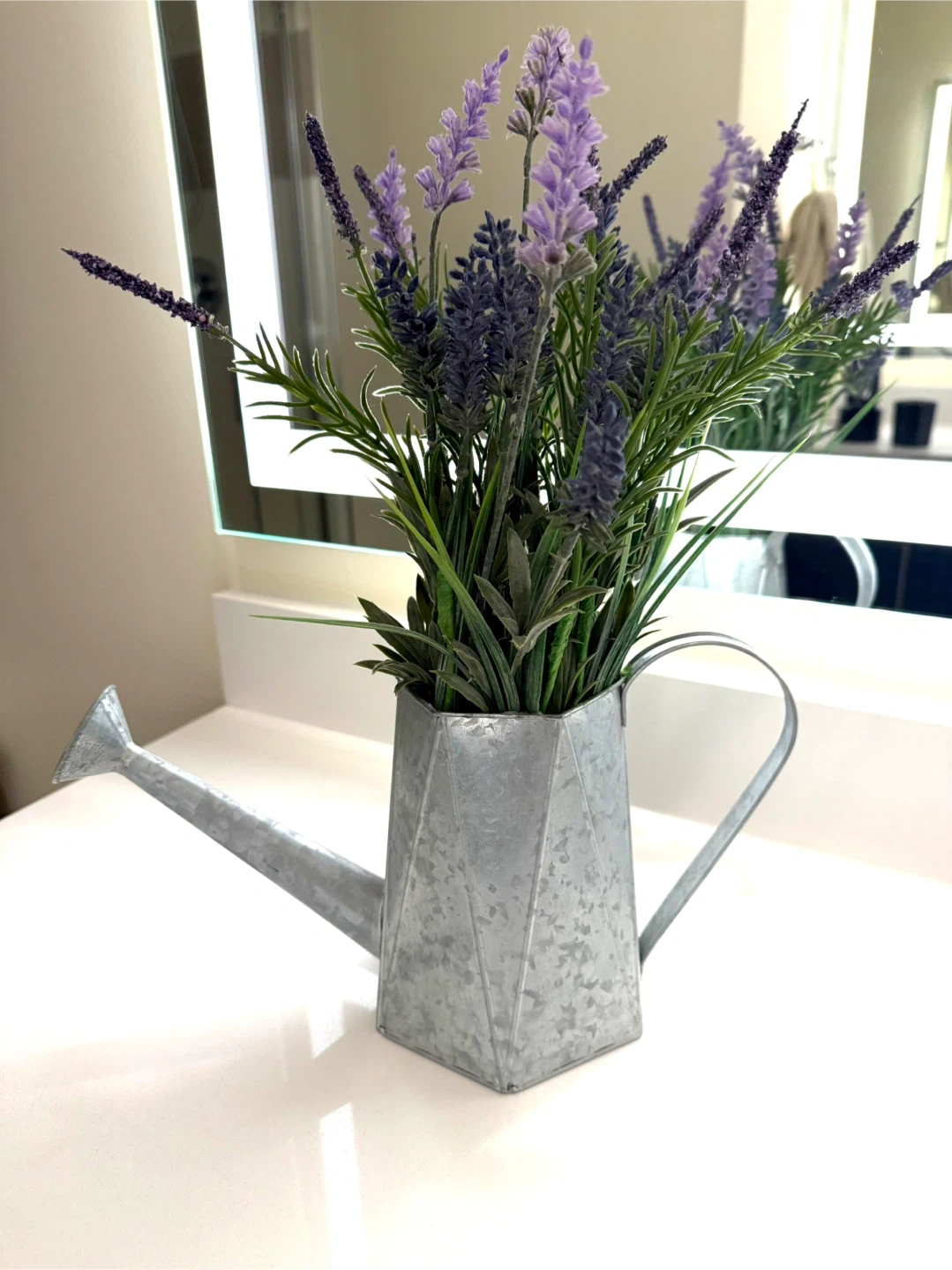 This decorative watering can holds a bunch of faux lavender flowers. It's made of galvanized metal with a geometric design. The artificial lavender adds a touch of farmhouse charm.