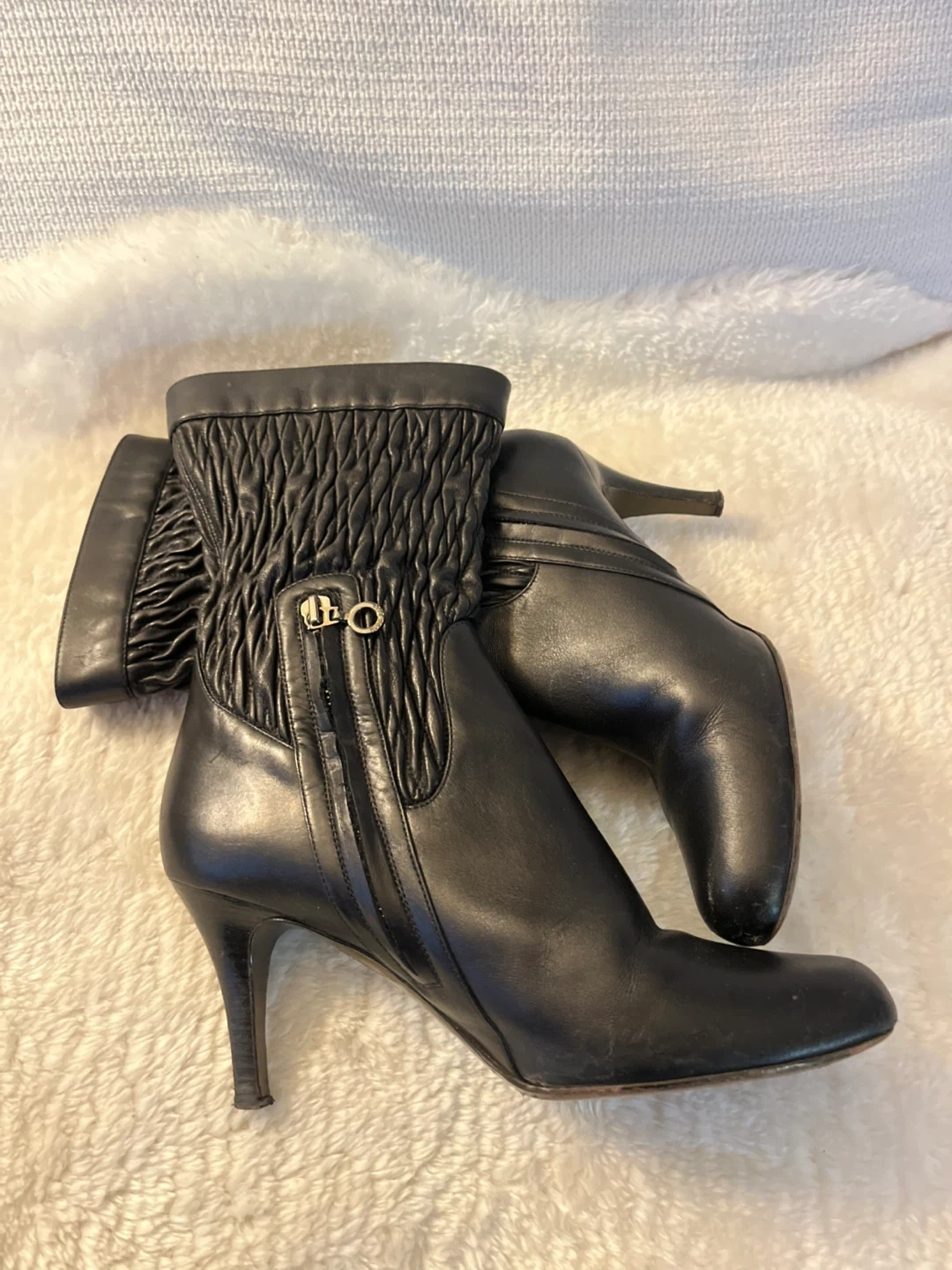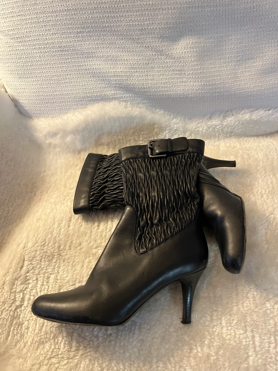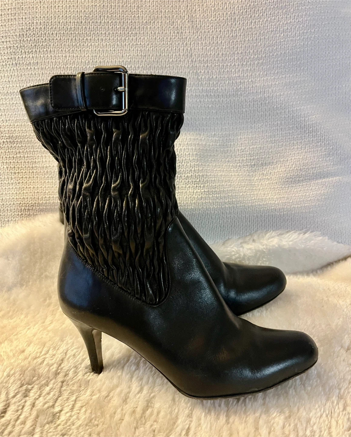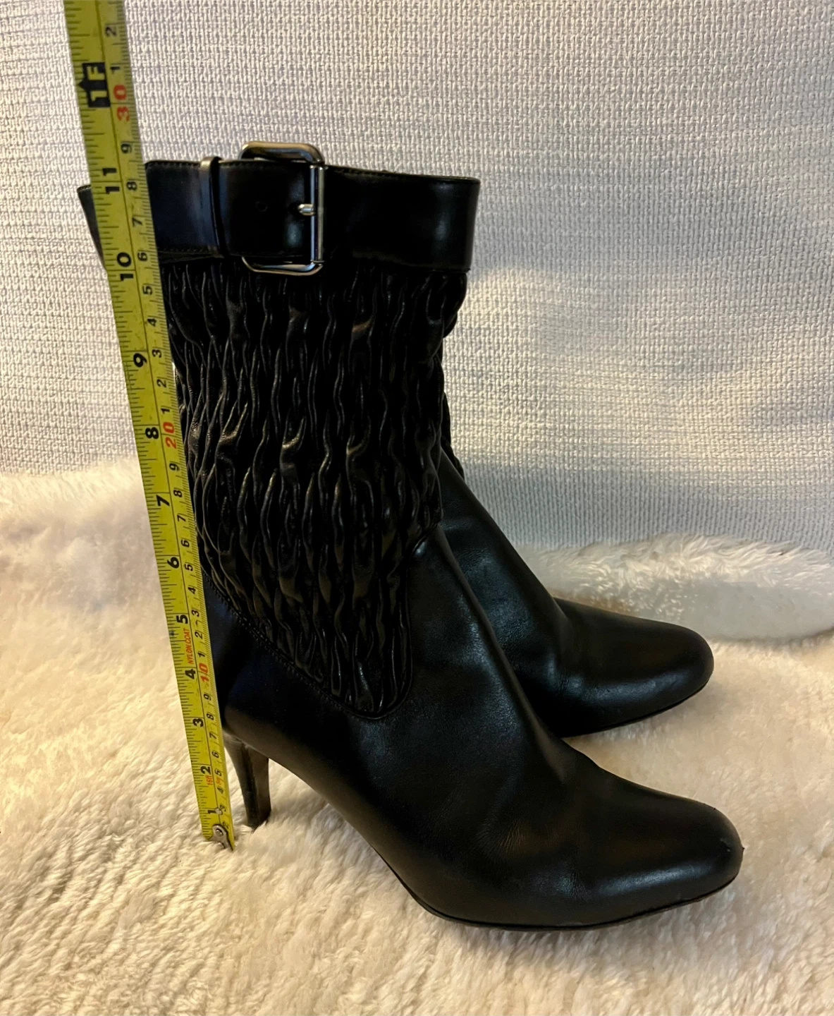 Hugo Boss Stylish black leather heel boots with an unique ruched design and a sleek buckle detail