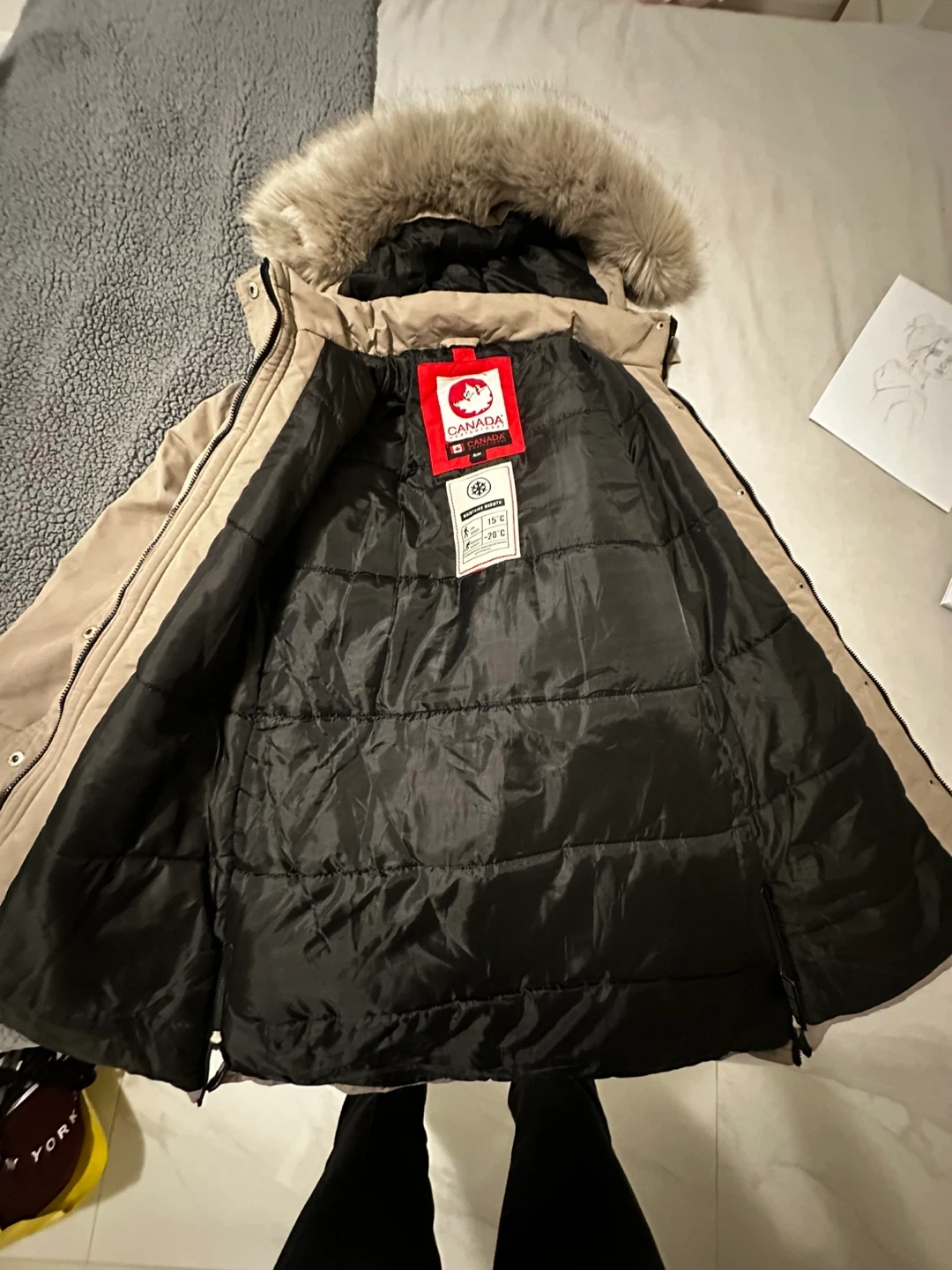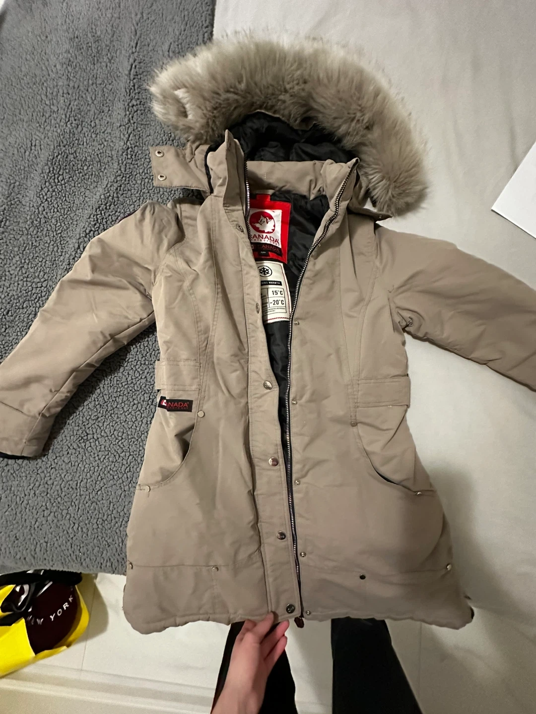 Barely used, never washed, This Canada weather gear is designed for cold weather, rated for -20°C. It features a coyote fur-trimmed hood and a durable exterior. It's a great choice for staying warm during chilly months! Originally $400.